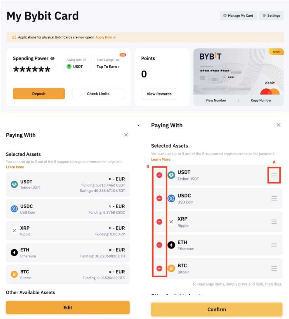 Click on Paying With and you will be prompted to a manage window. Then, you can either (a) manage the order by dragging it up and down or (b) add and remove the coins from the list. Once complete, you can make a purchase using your Bybit Card, the system will follow the payment priority you've set.