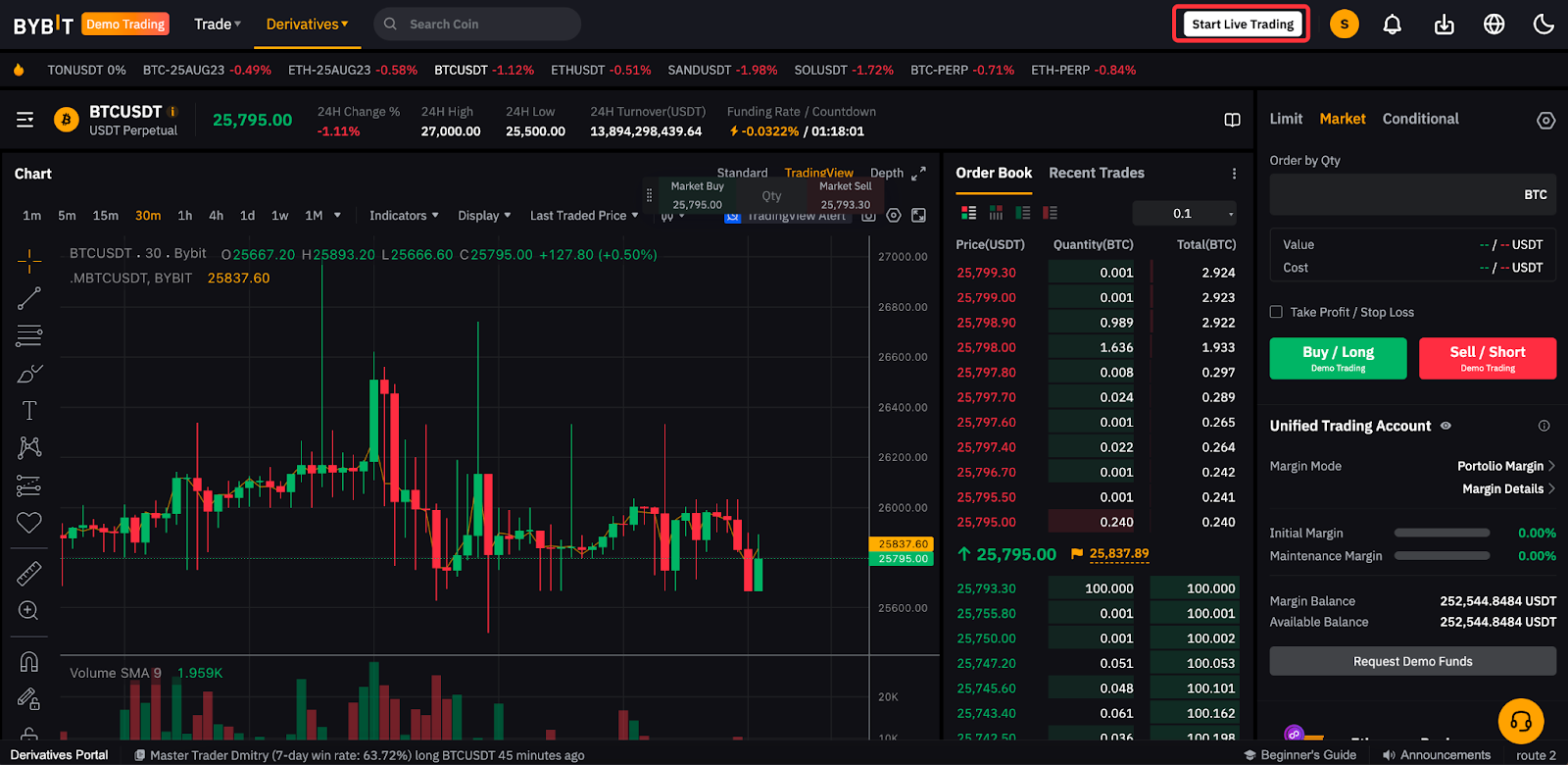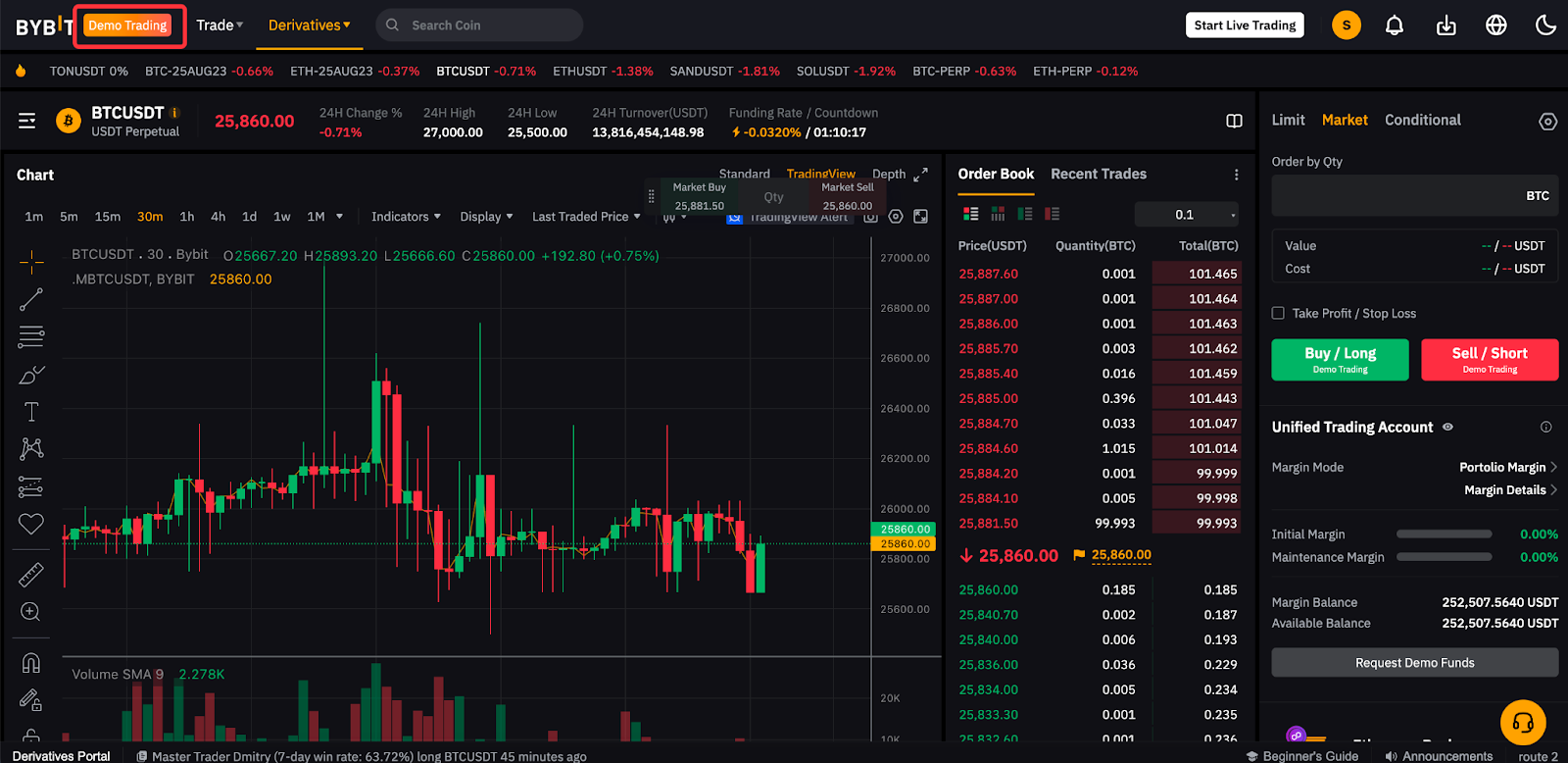 Поскольку для демо-трейдинга используется Единый торговый аккаунт (ЕTA), он поддерживает функции торговли на споте и деривативах.