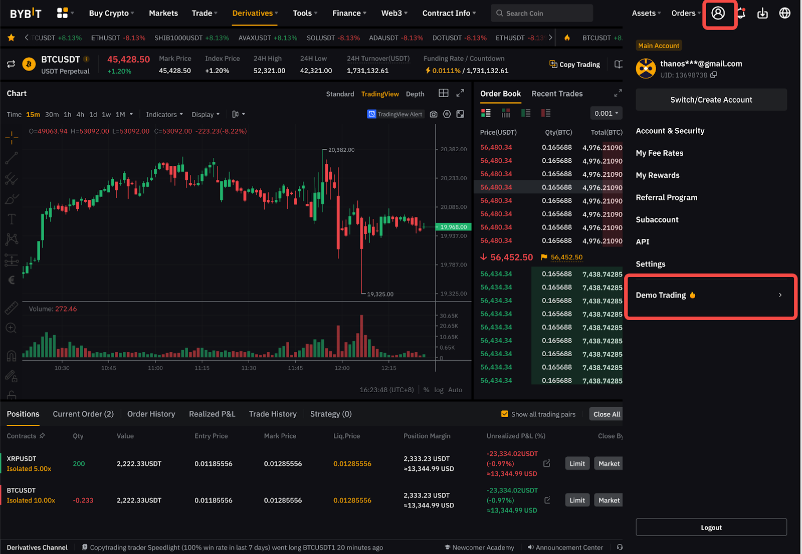 Вы можете начать демо-трейдинг на сайте Bybit, наведя курсор на значок профиля в правом верхнем углу и выбрав Демо-трейдинг. Чтобы выйти из режима демо-трейдинга и вернуться к торговле в реальном времени, просто нажмите Начать торговлю в реальном времени.