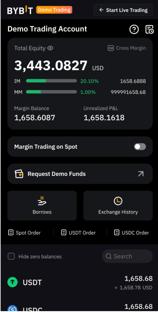 После инициализации демо-аккаунта Bybit пользователи автоматически получают виртуальные активы в размере 50 000 USDT, 50 000 USDC, 1 BTC и 1 ETH. Вам не нужно запрашивать средства вручную.