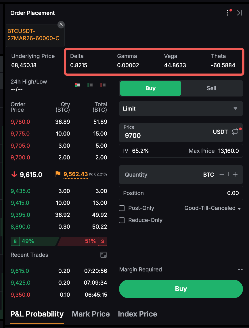 В зоне заполнения ордера можно увидеть значения греков для опциона, который вы хотите купить или продать, включая показатели дельта, гамма, вега и тета.