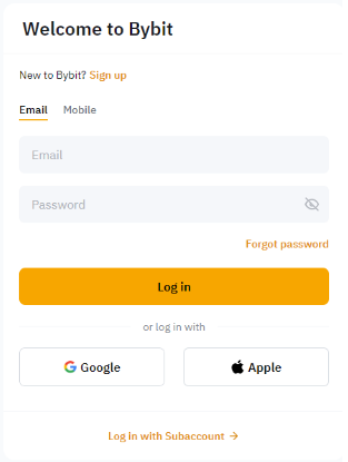 Шаг 1. Войдите в свою учетную запись через веб-сайт Bybit. Для этого введите свой зарегистрированный адрес электронной почты или номер мобильного телефона и пароль.