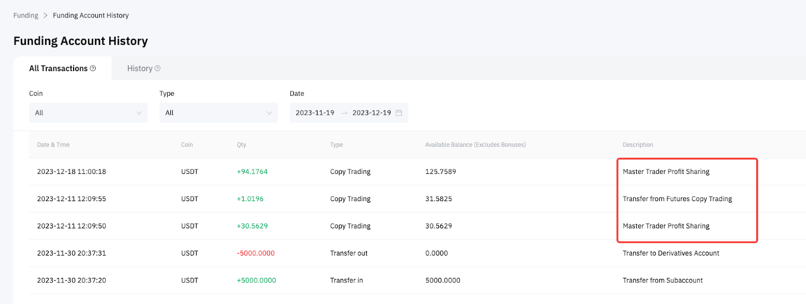 Ви можете переглянути запис про розподіл прибутку в історії акаунта фінансування.