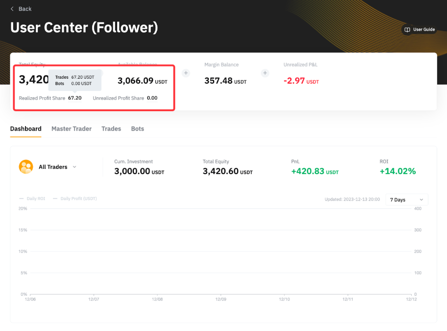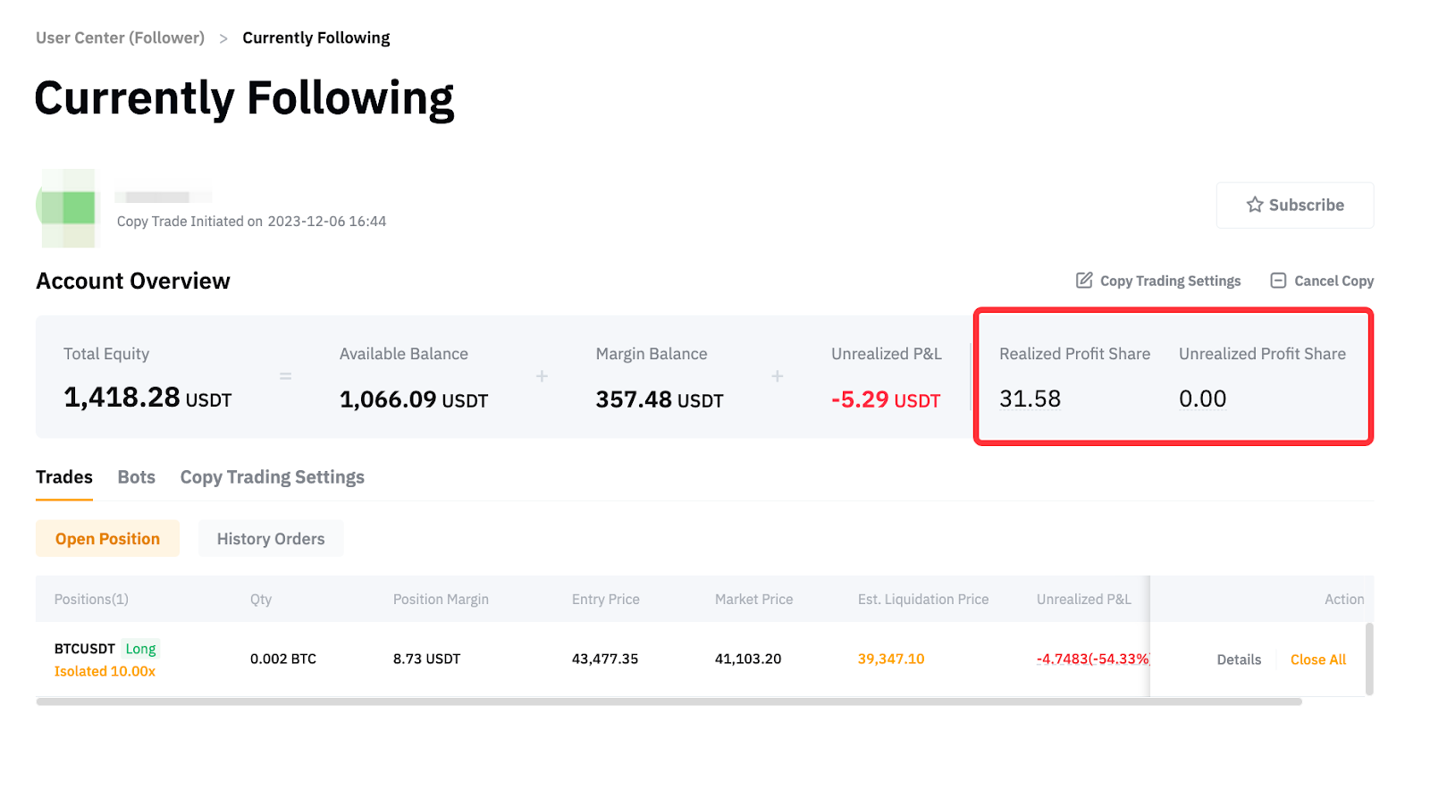 Перейдіть до Центру користувача (підписники), і ви зможете побачити свою Частку реалізованого та нереалізованого прибутку для угод за безстроковими контрактами в USDT.