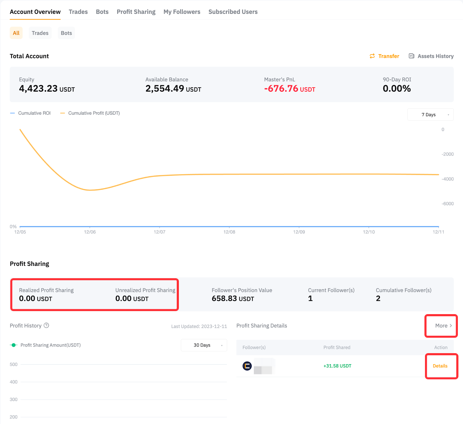 Якщо ви хочете переглянути розподіл прибутку під кожним майстер-трейдером, натисніть на Деталі відповідного майстер-трейдера, і ви можете побачити це в Огляді акаунта.