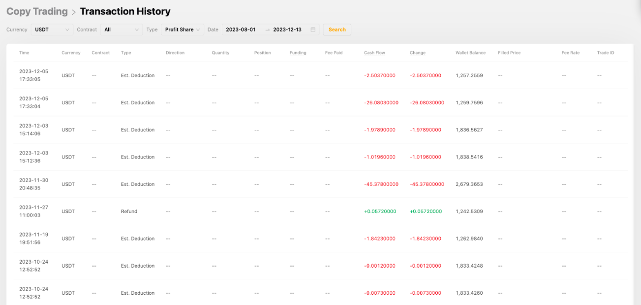 Ви можете переглянути запис про відрахування та повернення коштів на сторінці Копітрейдинг - Історія транзакцій.