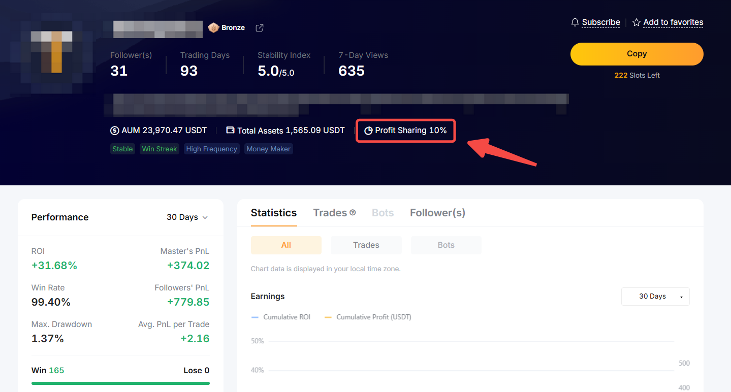 Майстер-трейдери можуть перевірити коефіцієнт розподілу прибутку на сторінці рейтингу майстер-трейдерів, тоді як підписники можуть переглянути коефіцієнт розподілу прибутку майстер-трейдера у профілі майстер-трейдера.