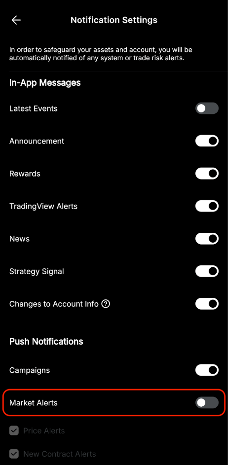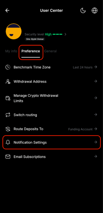 Щоб вимкнути сповіщення про ринок Bybit, перейдіть на сторінку налаштувань, натиснувши на значок профілю у верхньому лівому куті головної сторінки та натиснувши на значок Налаштування. Потім натисніть на Налаштування → Налаштування сповіщень, де ви можете визначити тип сповіщень, які бажаєте отримувати на свій телефон із застосунку Bybit.