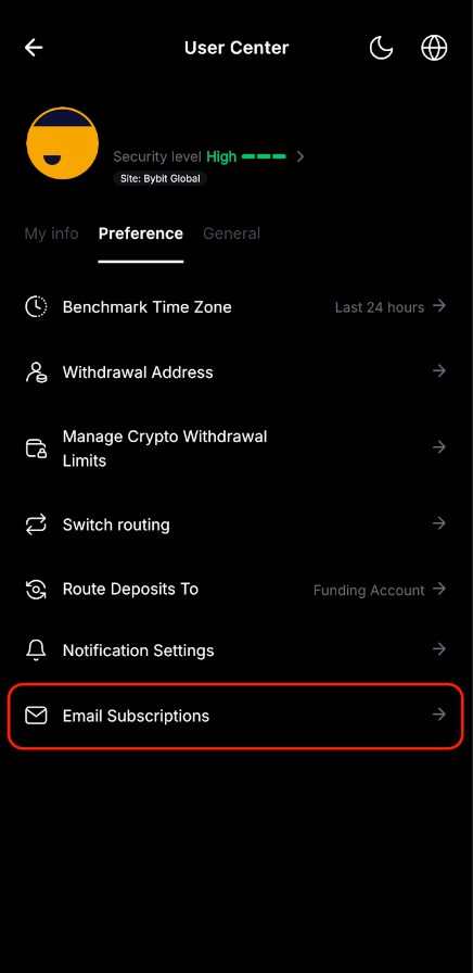 Щоб вимкнути електронну розсилку Bybit, ви можете перейти на сторінку налаштувань, натиснувши на значок профілю у верхньому лівому куті головної сторінки та натиснувши на значок Налаштування. Потім натисніть Налаштування → Електронні підписки, де ви можете налаштувати, які нагадування про подію та загальні оголошення ви хочете отримувати на своїй зареєстрованій адресі електронної пошти.