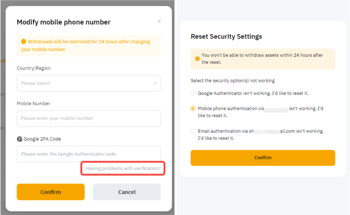 У вікні 2FA аутентифікації ви можете натиснути на кнопку "Проблеми з автентифікацією", щоб вибрати метод автентифікації, який не працює. Заповніть інформацію і після схвалення Вашого запиту наша служба підтримки допоможе Вам скинути 2FA аутентифікацію.
