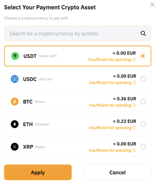 You can select up to 3 types of payment crypto for your Bybit Card transactions and the default payment priority is USDT > USDC > BTC. However, you can manage your spending currencies, including adding, removing, or changing the order on the Card Dashboard page.