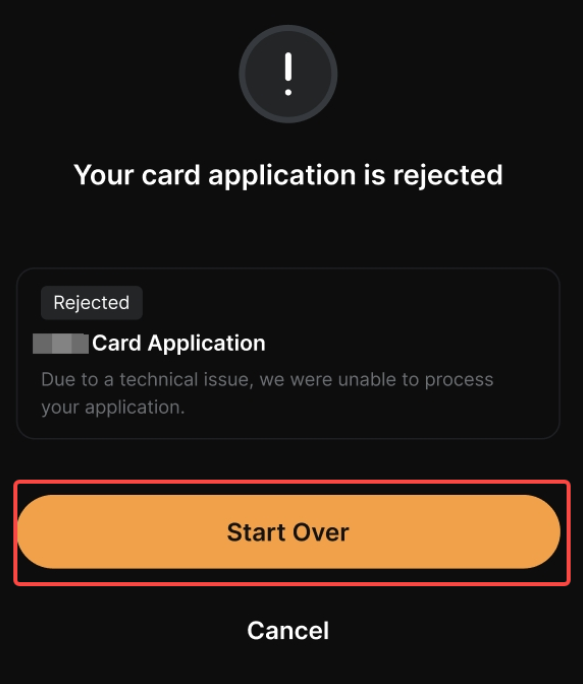 - Якщо вашу заявку на картку було відхилено після подання, ви завжди можете почати спочатку з новою заявкою.