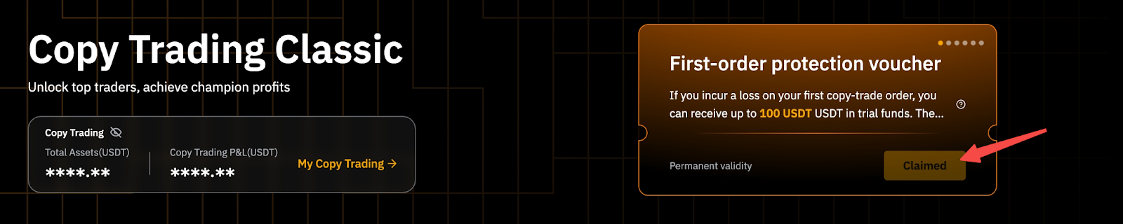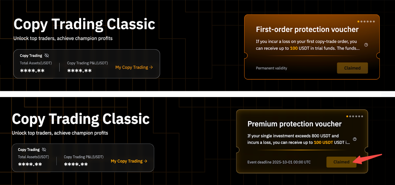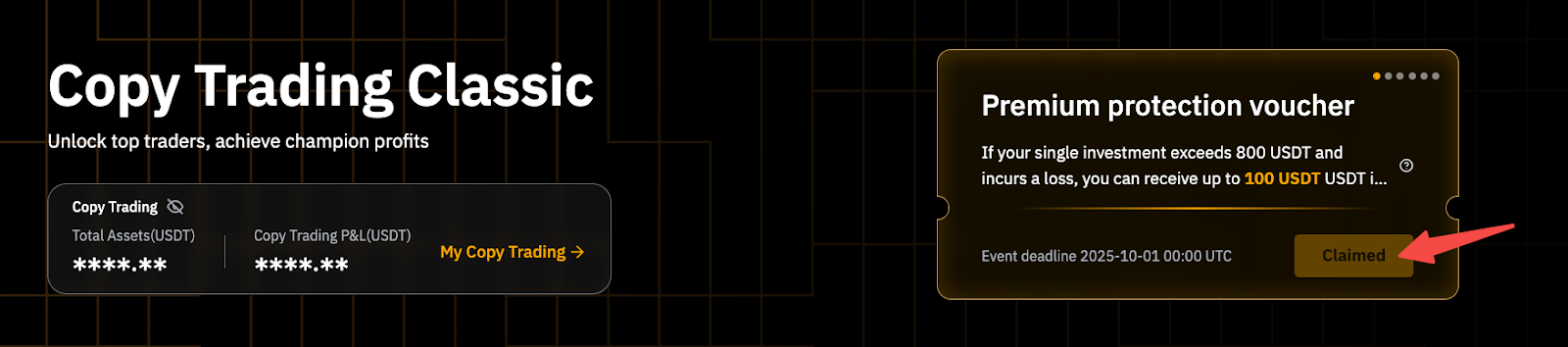 - Ваучер Преміум-захисту: Його можна отримати один раз на квартал у верхньому правому куті Копітрейдинг Classic або Копітрейдинг TradFi. Протягом того ж кварталу ви маєте право на отримання компенсації — до 100 USDT — за збитки від одного відповідного критеріям Майстер-трейдера. Цю перевагу можна використовувати лише один раз на квартал.