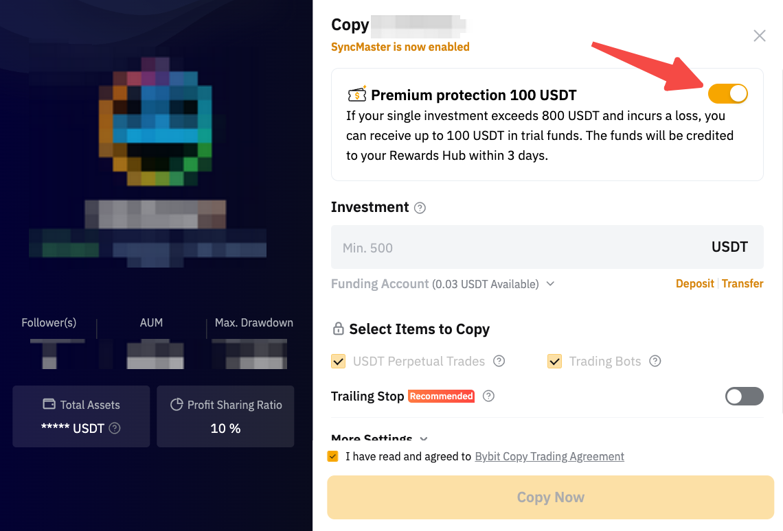 - Ваучер Преміум-захисту: Страхове покриття може бути застосоване до Майстер-трейдерів, у яких ви ввімкнули перемикач для активації ваучера лише у вікні інвестування.