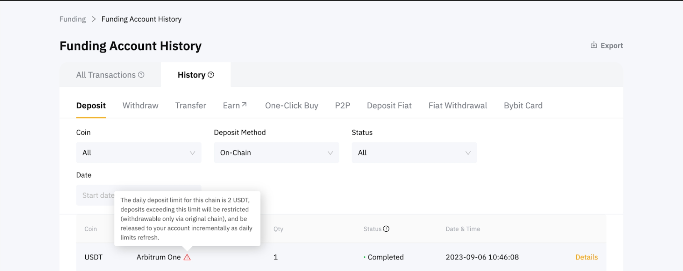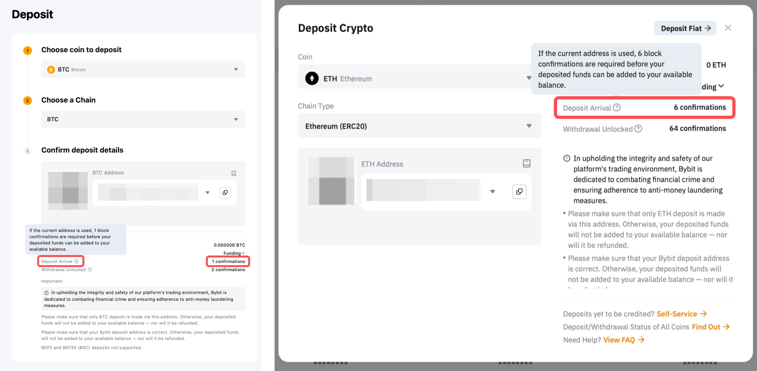 Bybit має особливі вимоги до кількості підтверджень у блокчейні, необхідних для різних монет, перш ніж суму переказу можна буде зарахувати у ваш Bybit Wallet.