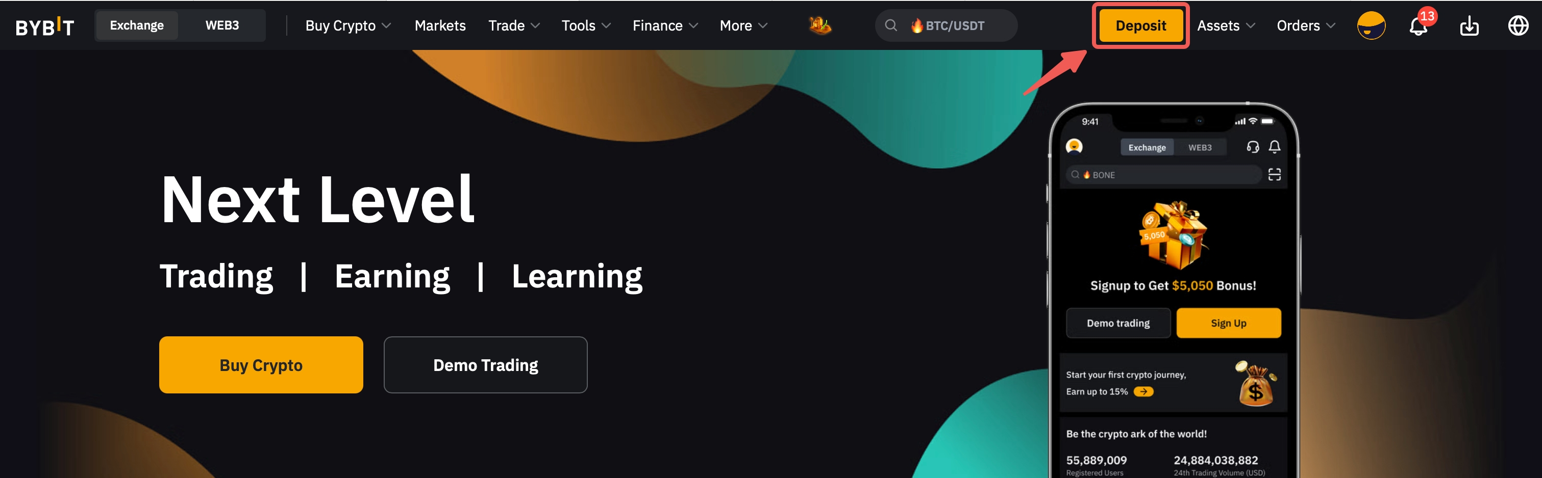 Крім того, ви можете також знайти кнопку «Поповнити» у верхньому правому куті сторінки Bybit.
