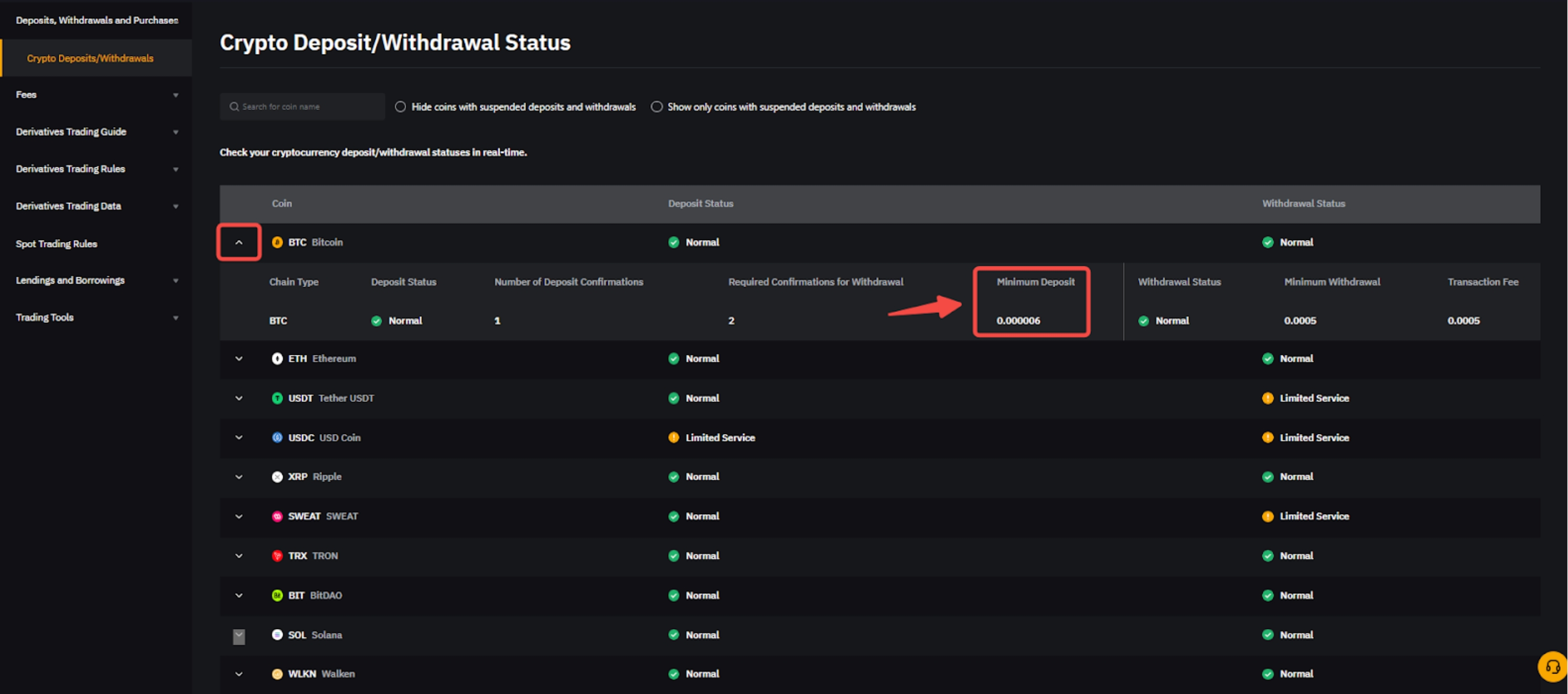 Список мінімальних депозитів для кожної монети можна знайти на сторінці Статус поповнення/виведення. Натисніть на спадну кнопку монети, яку ви хочете внести або вивести, щоб переглянути статус поповнення для кожного підтримуваного типу мережі, а також необхідну інформацію для успішного внесення депозиту.