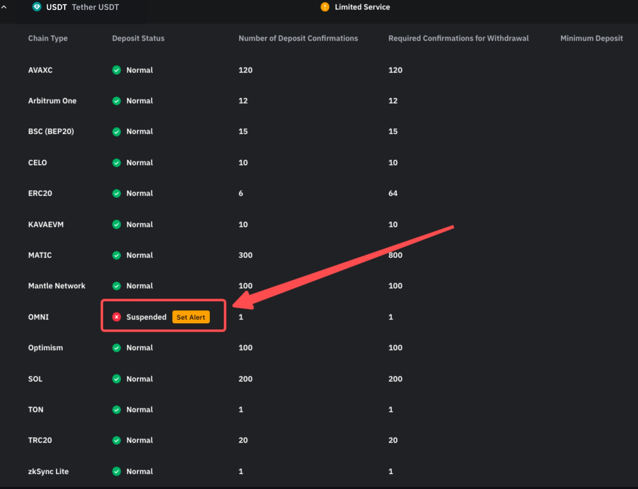 Крім того, ви можете перейти на сторінку статусу депозиту/виведення та знайти токен та мережу. Кнопка «Встановити сповіщення» відображається поруч зі статусом депозиту «Призупинено».