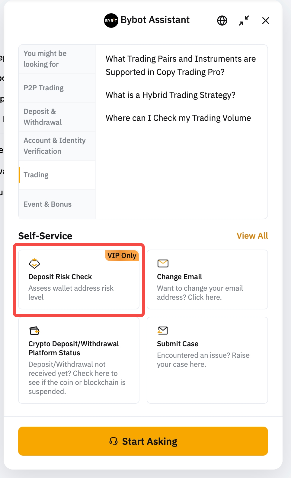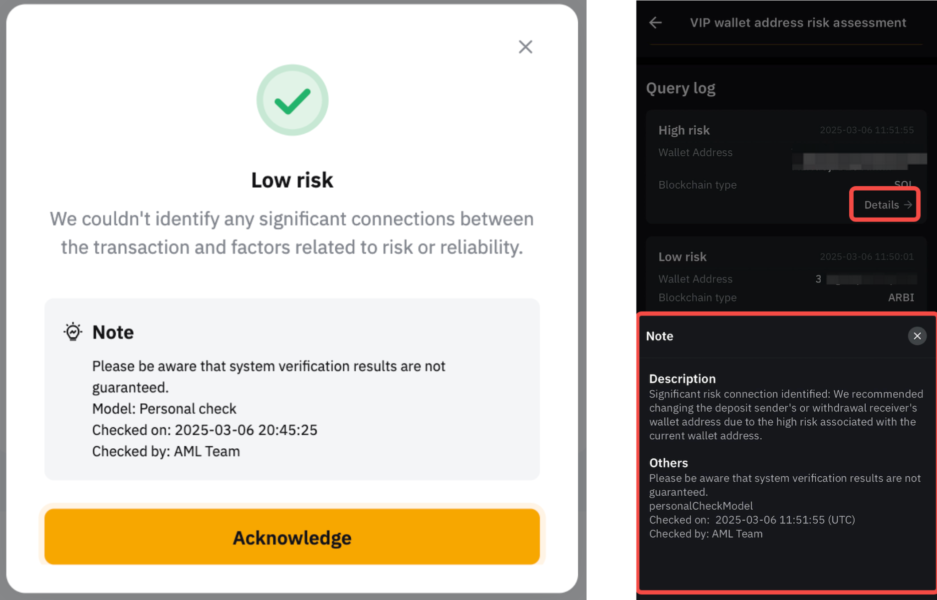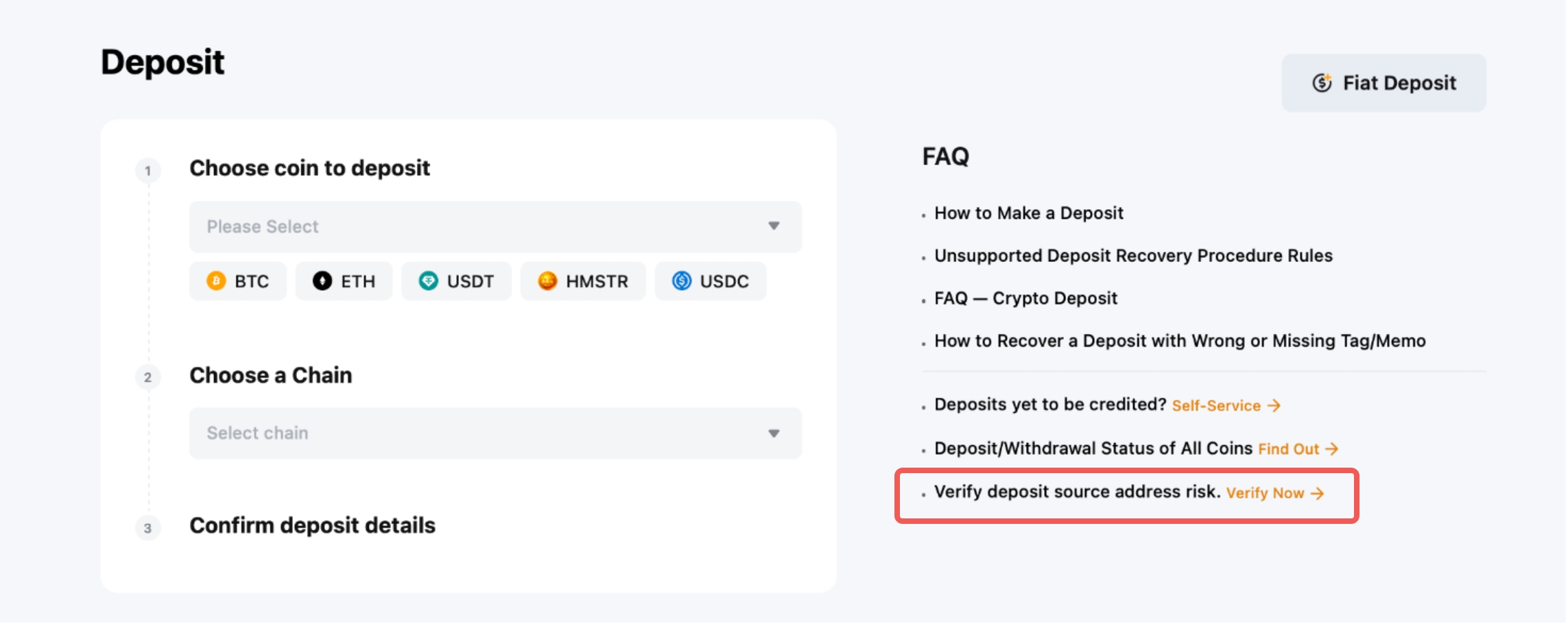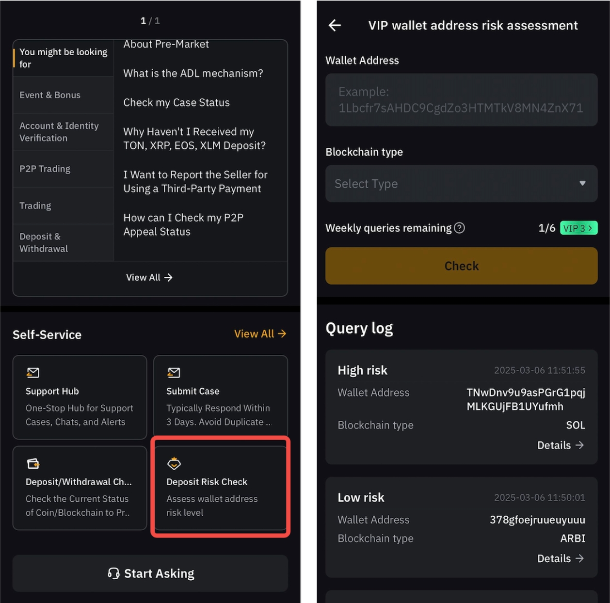 Так, зараз лише VIP-користувачі можуть отримати доступ до функції перевірки ризику адреси через бота самообслуговування та сторінку депозиту. Щоб отримати доступ до сторінки, користувачі можуть натиснути Перевірити ризик адреси джерела депозиту.