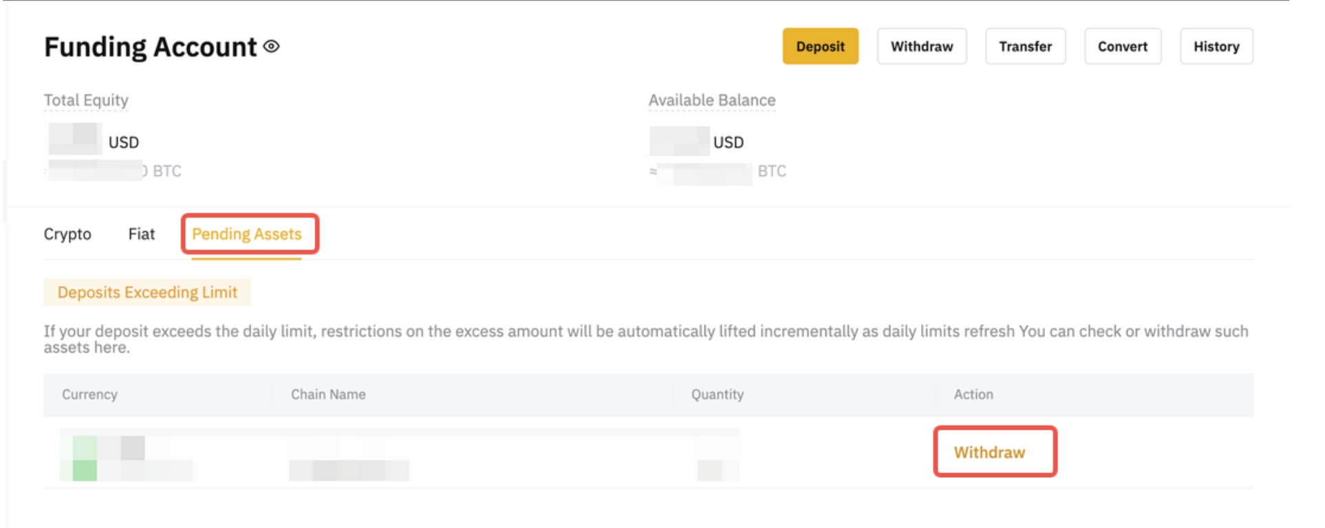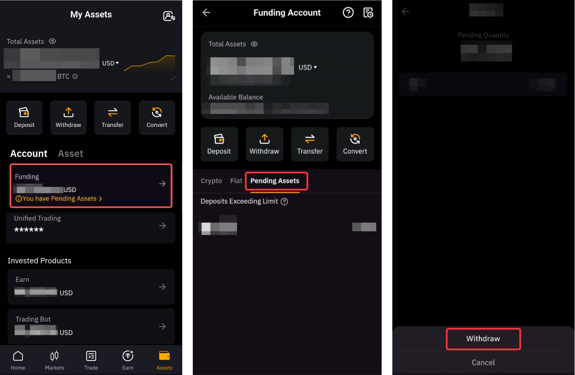 Активи в стані очікування стосуються депозитів, що очікують підтвердження зарахування для певного блокчейну. Ці депозити потребують додаткового часу, перш ніж можна буде отримати доступ до них використання в торгівлі або виведення відповідно до ліміту зарахування депозиту.
