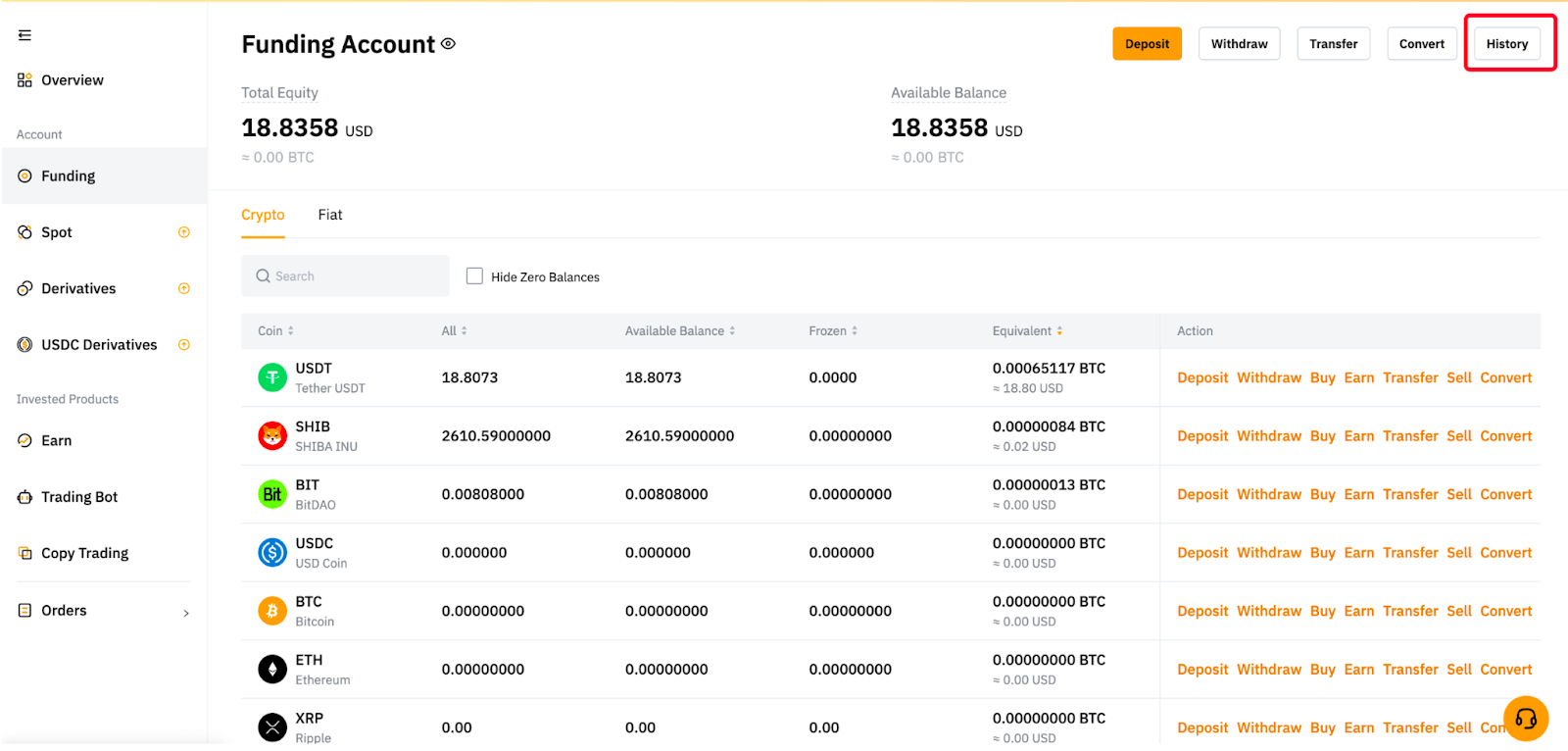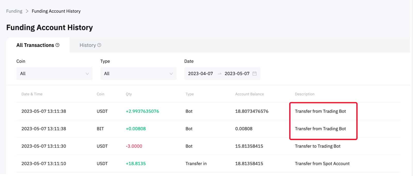 Натисніть Активи → акаунт фінансування → Історія → Виберіть Бот у вкладці Тип на сторінці Усі транзакції.
