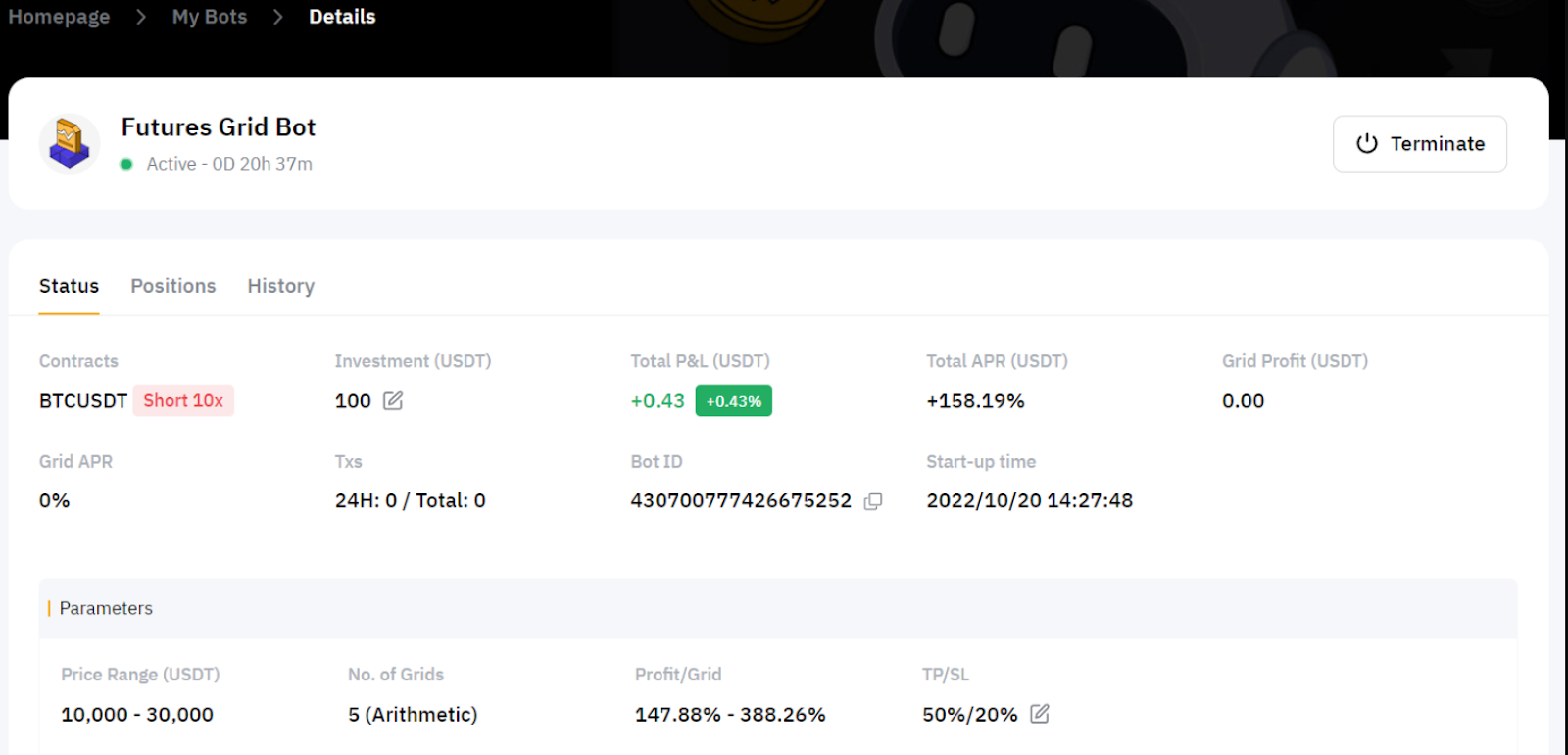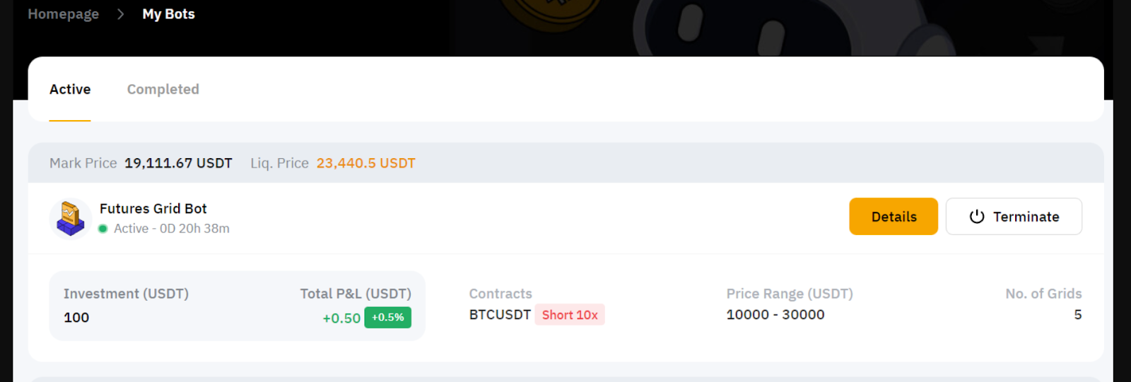 Перейдіть до розділу Мої боти, щоб переглянути всі активні та завершені угоди. Натисніть Деталі, щоб переглянути деталі угоди: прибуток(и), загальну річну відсоткову ставку та діапазон цін.
