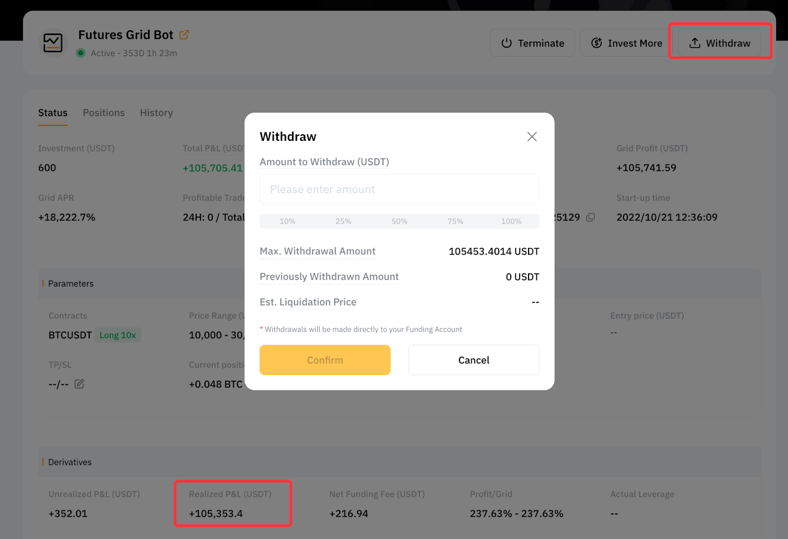 Поки ваш грід-бот працює, весь прибуток залишається в ньому. Після завершення роботи бота, сума ваших інвестицій і прибуток будуть автоматично переведені на ваш акаунт фінансування.