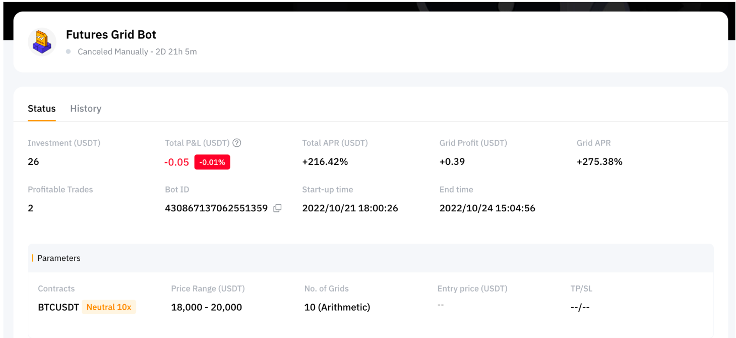 Усі торгові боти направлятимуться безпосередньо через акаунт Фінансування. Коли ви створюєте ф’ючерсний грід-бот, система автоматично переказуватиме суму інвестиції з вашого акаунту Фінансування до торгового бота. Після припинення роботи бота сума інвестиції та прибуток (за наявності) також буде переведено назад на ваш акаунт Фінансування.