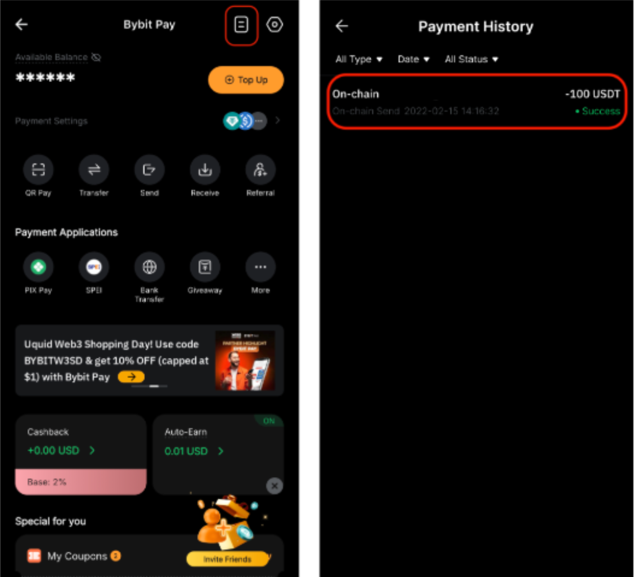 Перейдіть на сторінку «Оплата за допомогою функції Bybit Pay» та торкніться значка «Історія платежів» у верхньому правому куті.