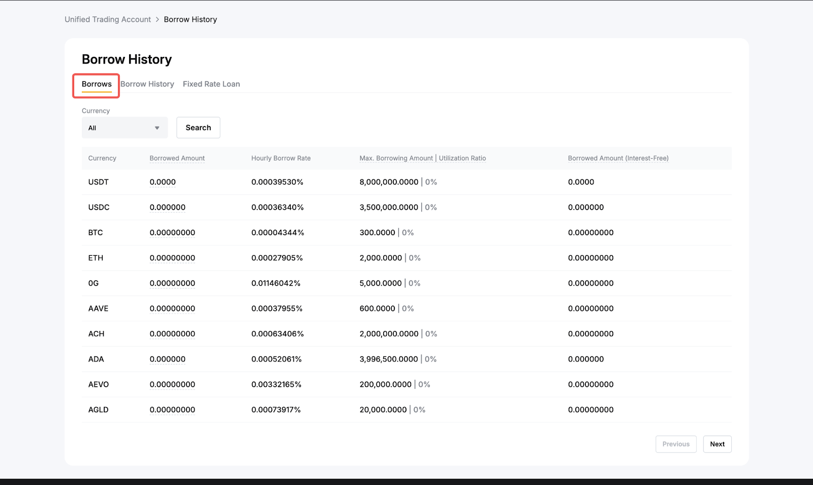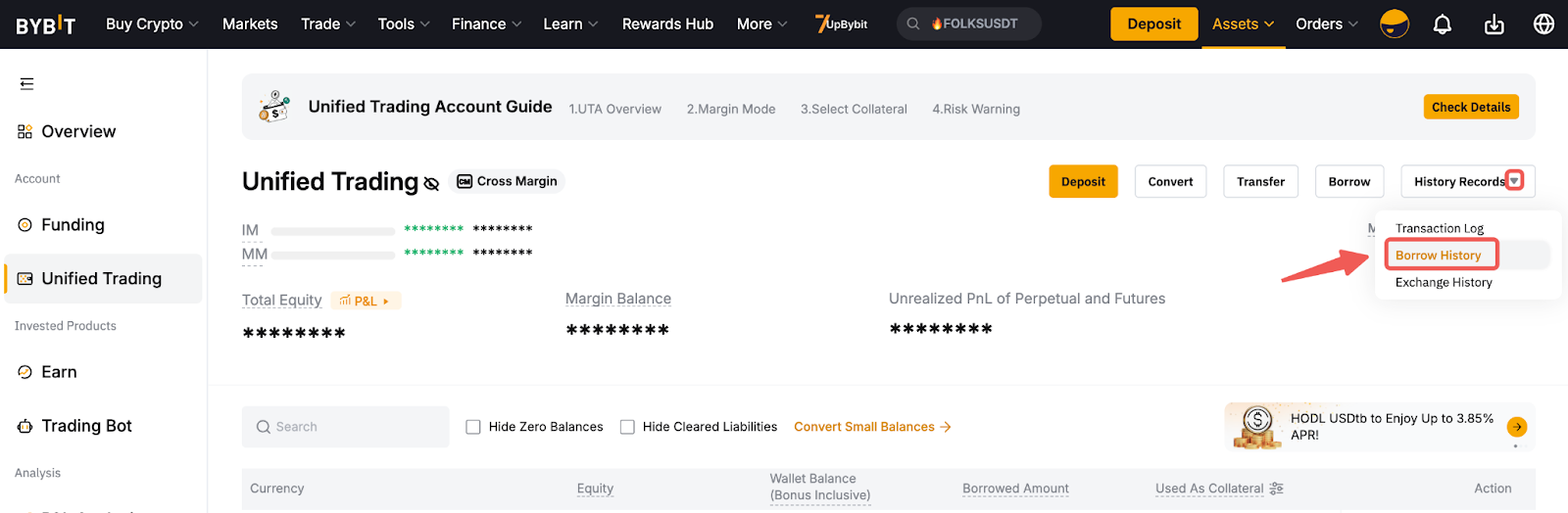 Також ви можете перейти на Єдиний торговий акаунт → Записи історії → Історія позик. Там ви зможете побачити свою погодинну відсоткову ставку та деталі запозичень.