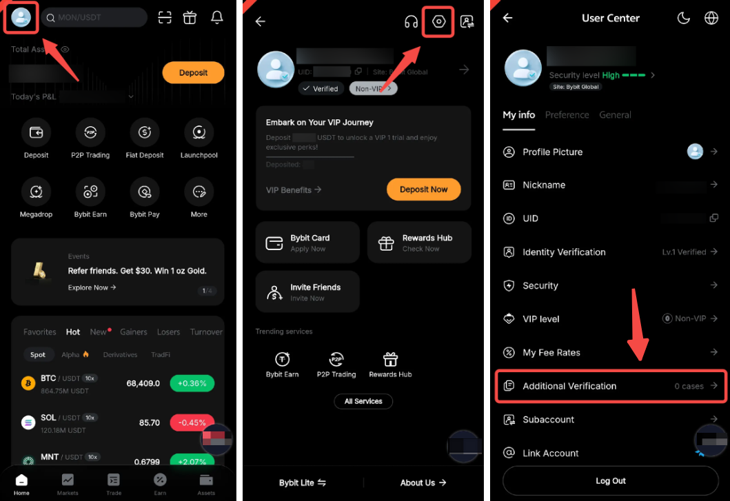 Увійдіть у застосунок Bybit і перейдіть у розділ «Значок профілю» → «Налаштування» → «Додаткова верифікація».