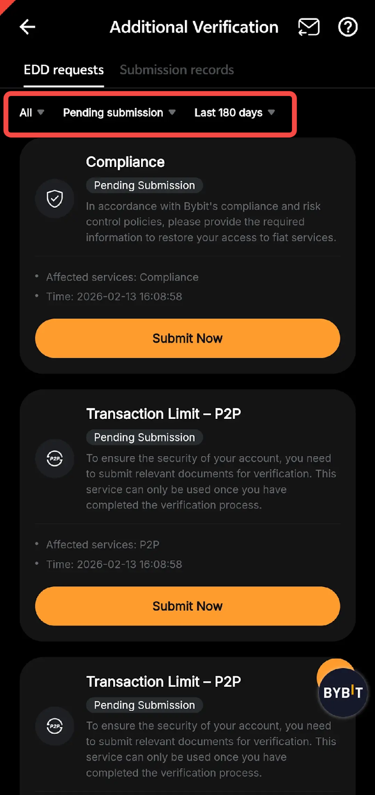 Розширена належна перевірка (EDD) — це додатковий процес верифікації, який Bybit може вимагати для певних послуг, зокрема для внесення депозитів, виведення коштів, купівлі криптовалюти, використання картки Bybit та інших відповідних фіатних послуг.