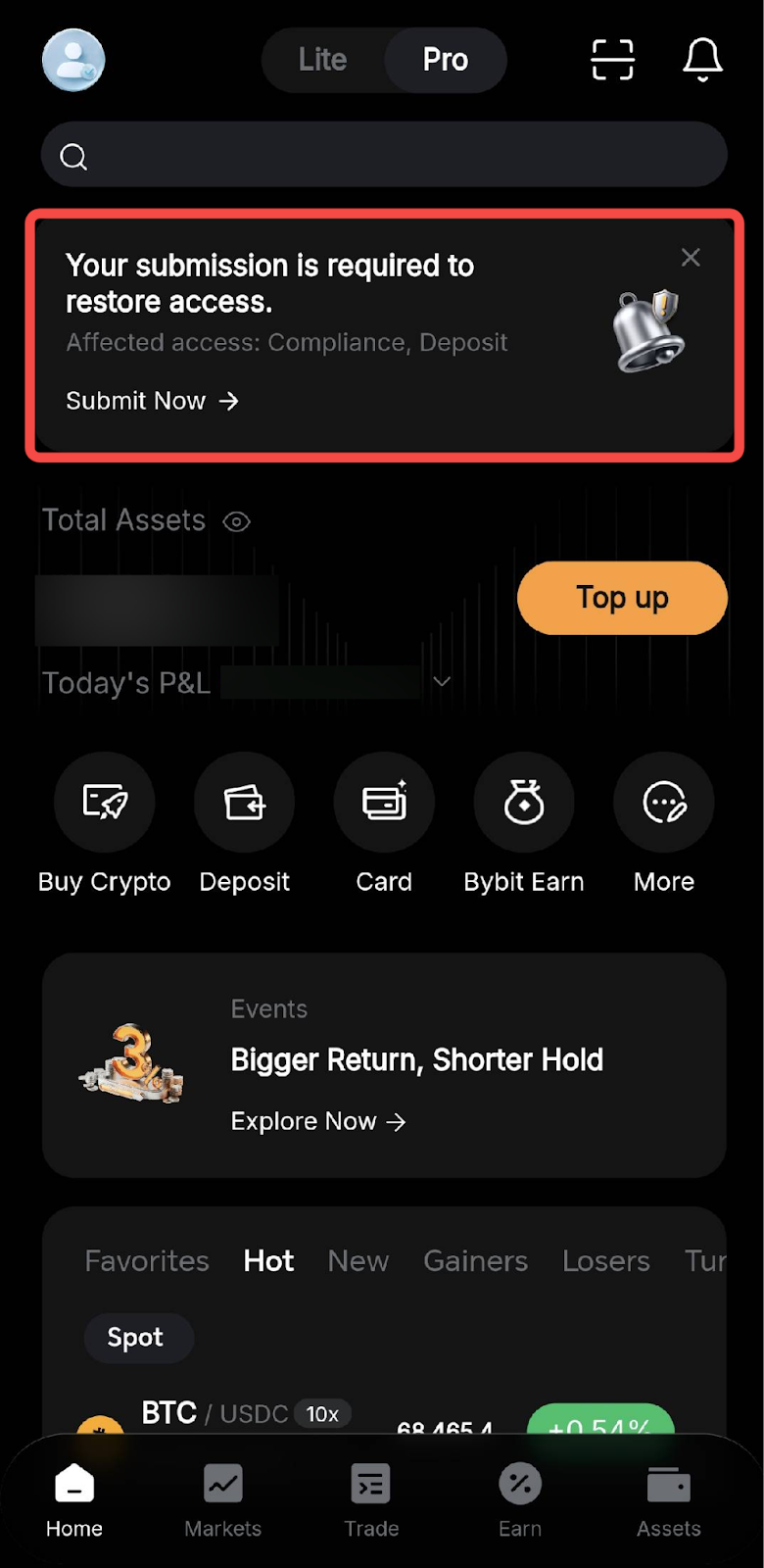 Крок 1: Увійдіть у застосунок Bybit. Якщо потрібна EDD, у верхній частині головної сторінки з’явиться запит на подання документів.