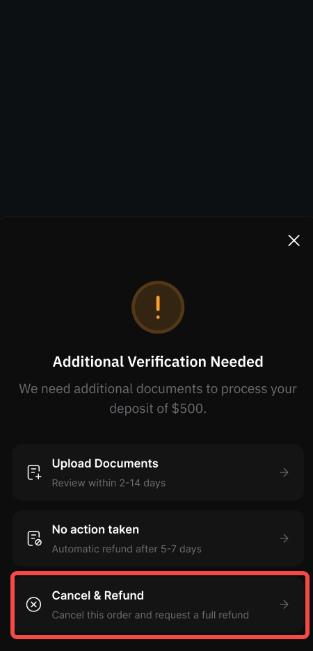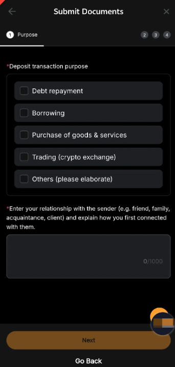 – Запит на верифікацію EDD також може з’явитися під час внесення фіатного депозиту або виведення коштів, а також під час використання інших відповідних послуг. У таких випадках дотримуйтесь інструкцій на екрані, щоб завершити подання документів.