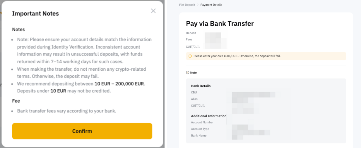 2. Наведені вище скріншоти призначені лише для ілюстрації та були взяті для різних валют і сторінок способів оплати. Отже, ваші сторінки фіатного депозиту можуть дещо відрізнятися та містити необхідні поля для вибраної валюти та способів оплати.