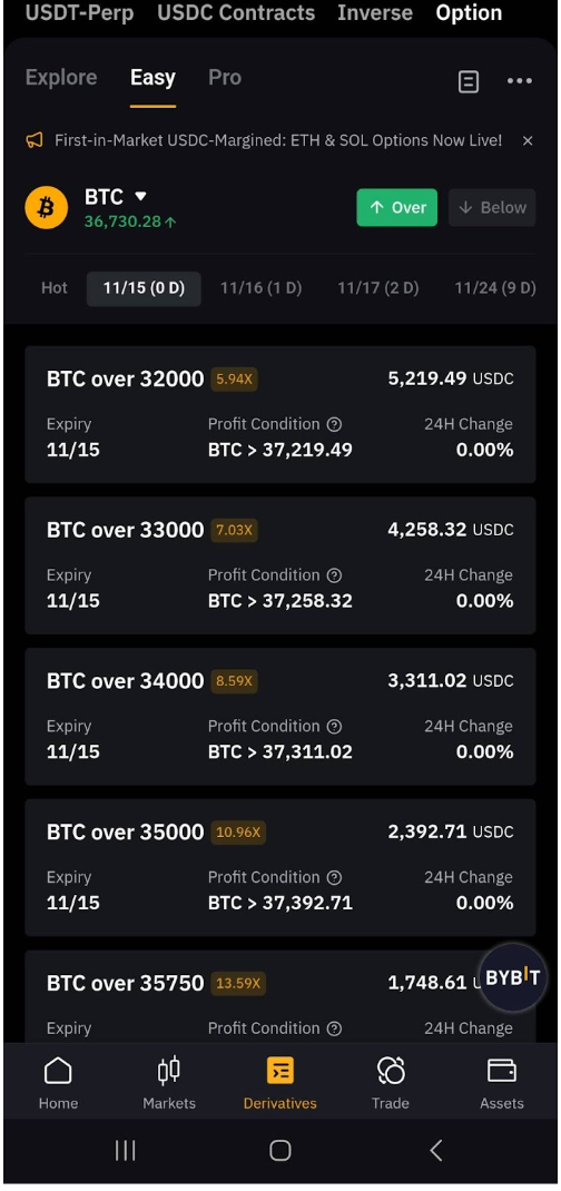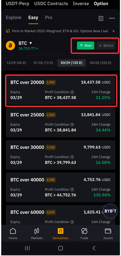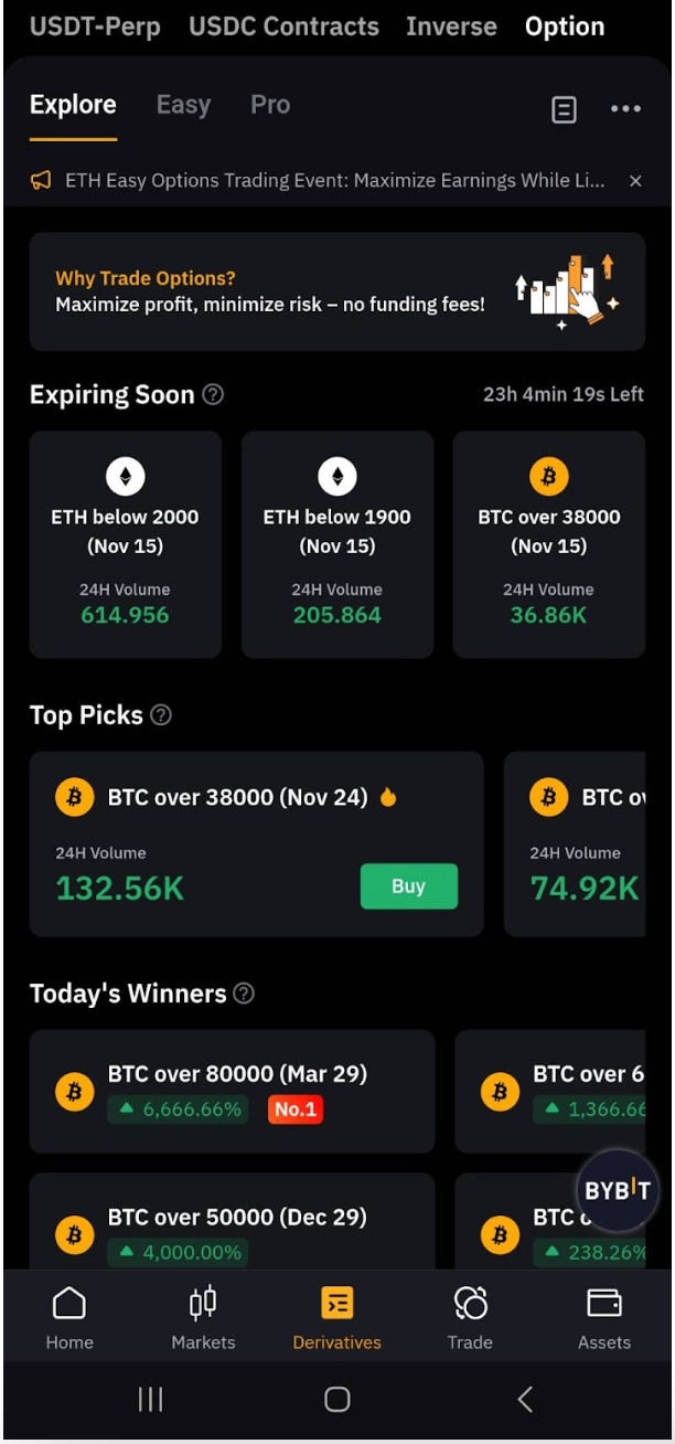 Для доступу до простих опціонів Bybit спершу запустіть застосунок Bybit. На головній сторінці виберіть Деривативи та натисніть Опціон. Ви перейдете на сторінку опціонів Bybit, де зможете вибрати один із трьох режимів залежно від вашого досвіду торгівлі опціонами.