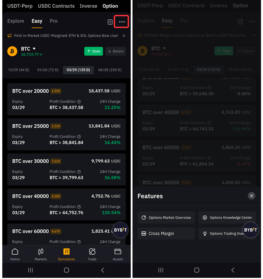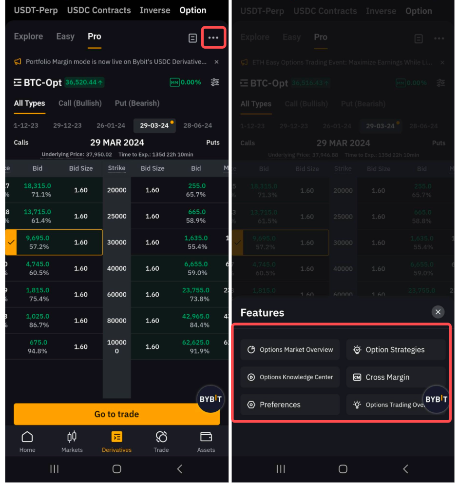 Режим Pro пропонує класичний вид опціонних контрактів. Трейдери можуть купувати чи продавати опціони пут або кол, а також гортати пальцем ліворуч або праворуч, щоб вибрати бажану дату закінчення терміну дії. Подібно до режиму Easy, трейдери можуть натиснути три крапки, щоб вибирати різні режими маржі, налаштовувати параметри або моделювати опціонні стратегії.