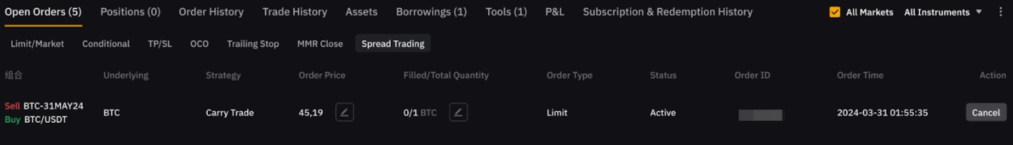 Ви можете отримати доступ до своїх ордерів торгівлі спредами з будь-якої торгової сторінки, зокрема торгівлі спредами, Спотової торгівлі та Ф’ючерсної торгівлі, оскільки всі вони мають однакові дані про ордери.