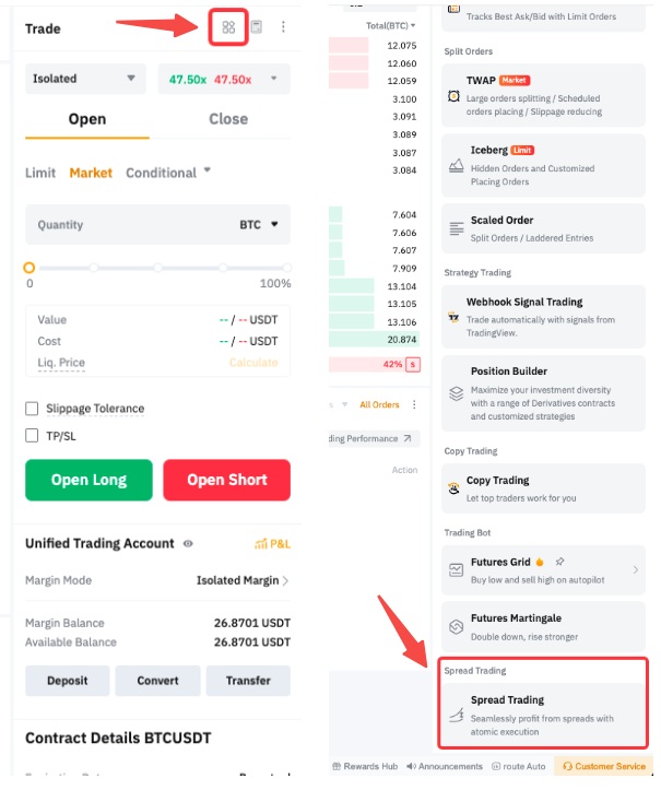 Ви також можете знайти торгівлю спредами на вкладці Інструменти на правій панелі сторінки Спотової/Ф’ючерсної торгівлі.