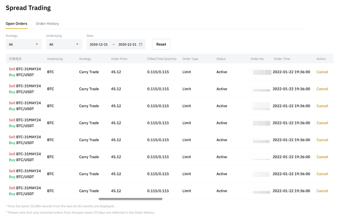 - Лише Безстроковий: показує ордери торгівлі спредами, які включають Безстрокові контракти.