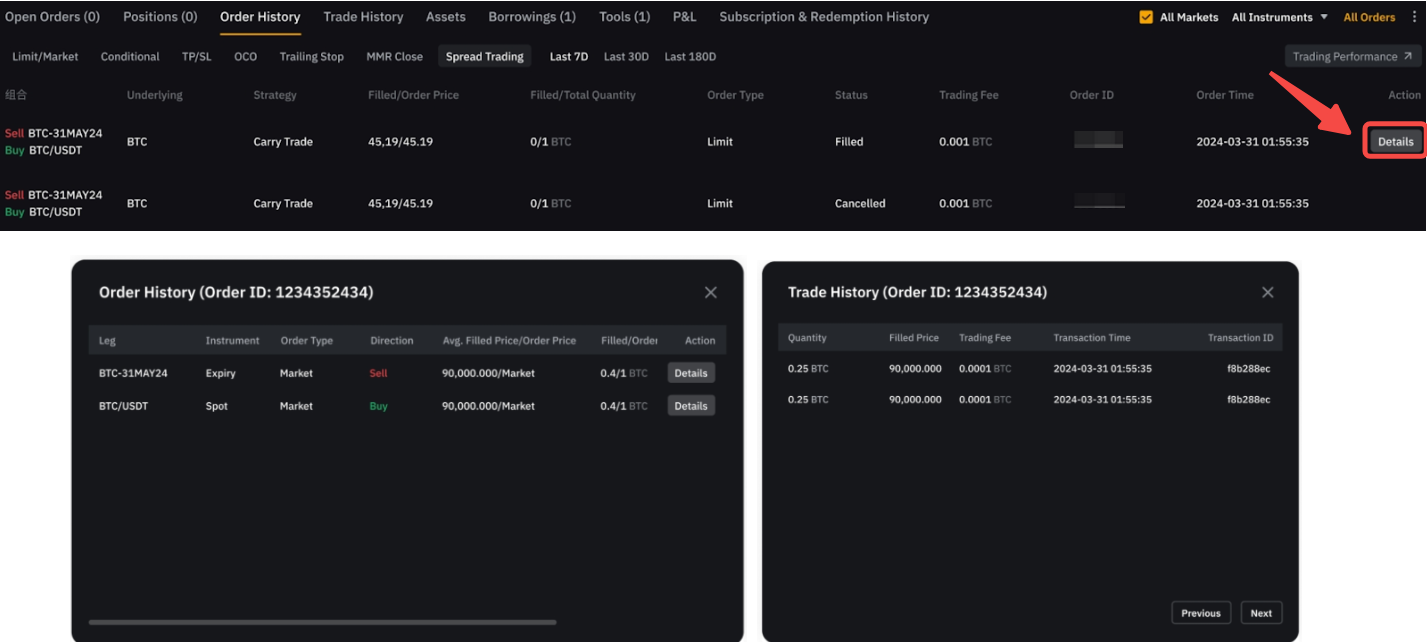 Для виконаних ордерів перейдіть до Історії ордерів і натисніть Торгівля спредами. Натисніть Деталі в розділі Дія, щоб переглянути інформацію про ордери для кожної частини. Ще раз натисніть Деталі, щоб отримати додаткову інформацію.