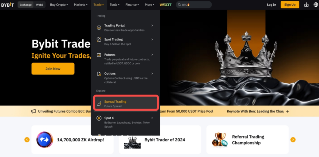 Крок 1. Увійдіть на сайт Bybit і клацніть Торгівля → Торгівля спредами на панелі навігації, щоб отримати доступ до сторінки торгівлі спредами.