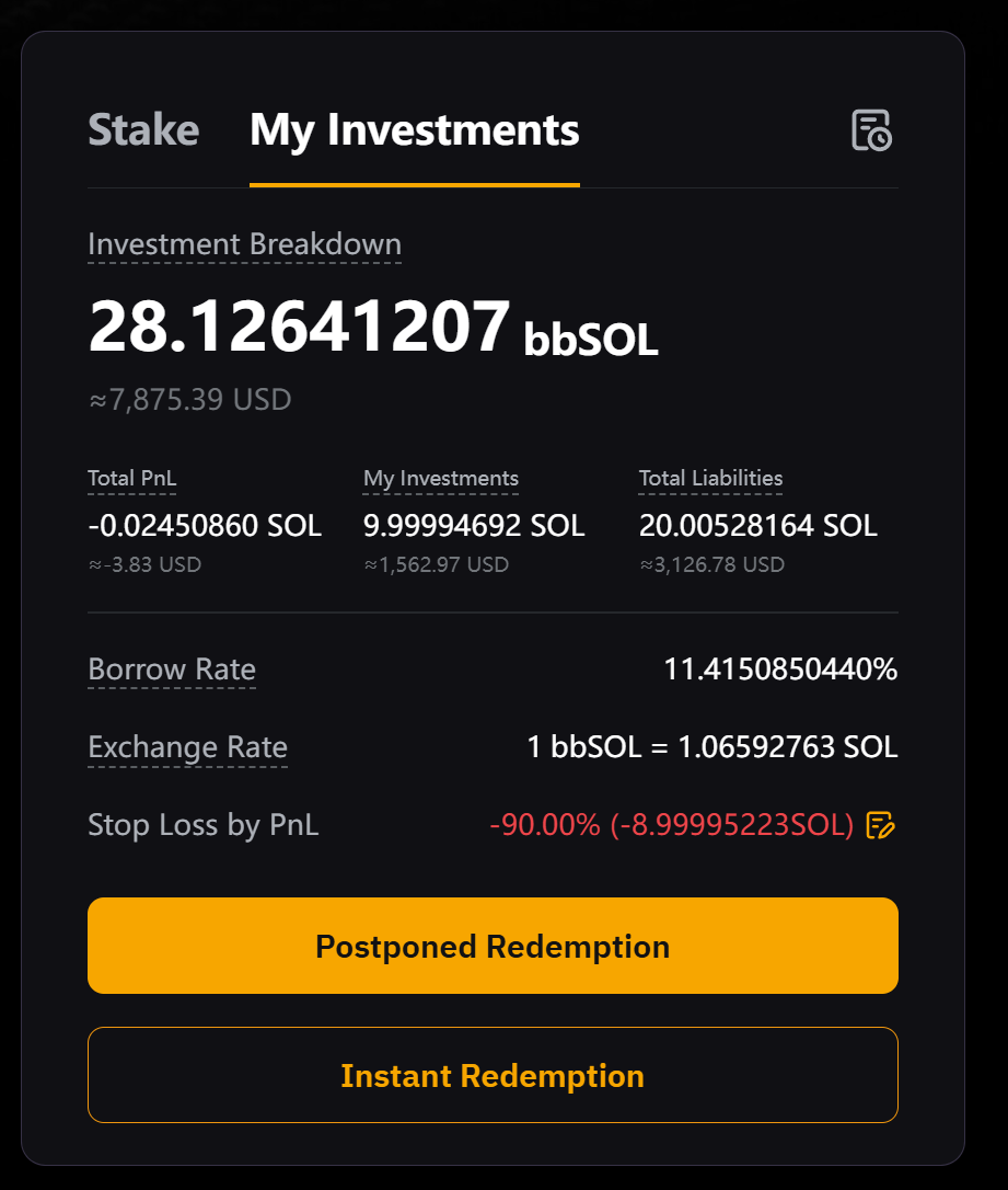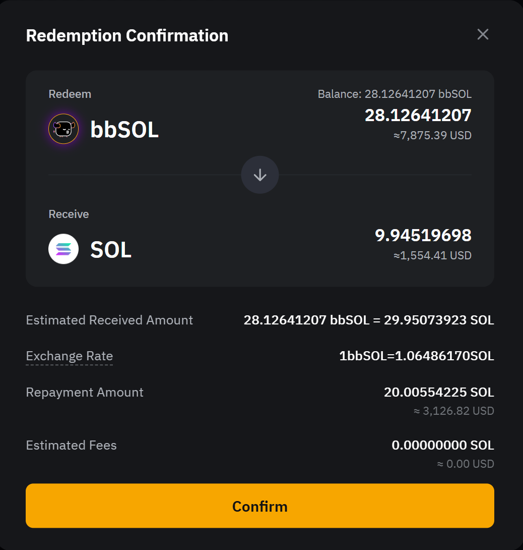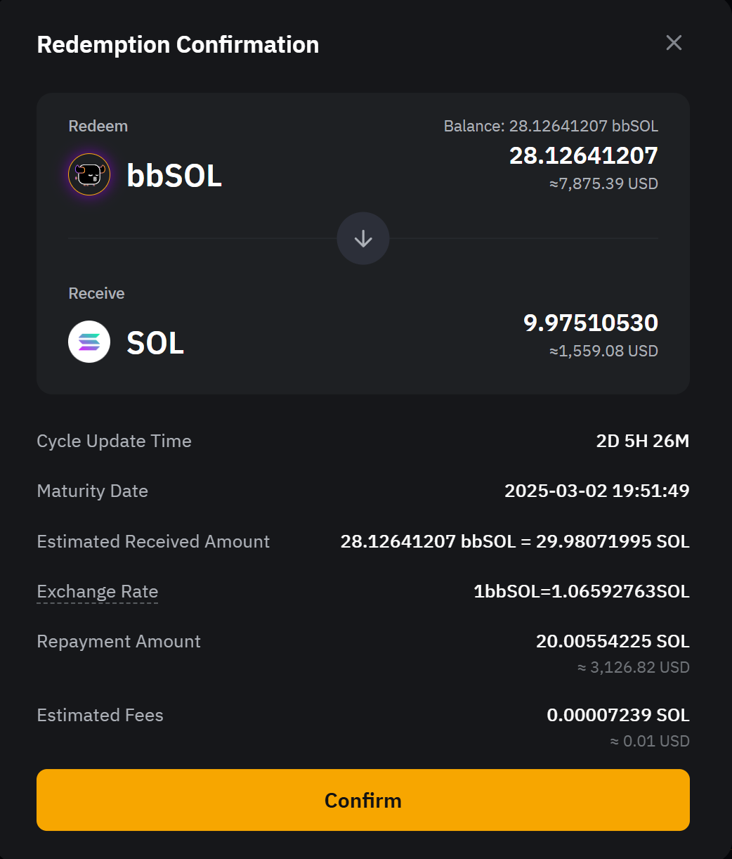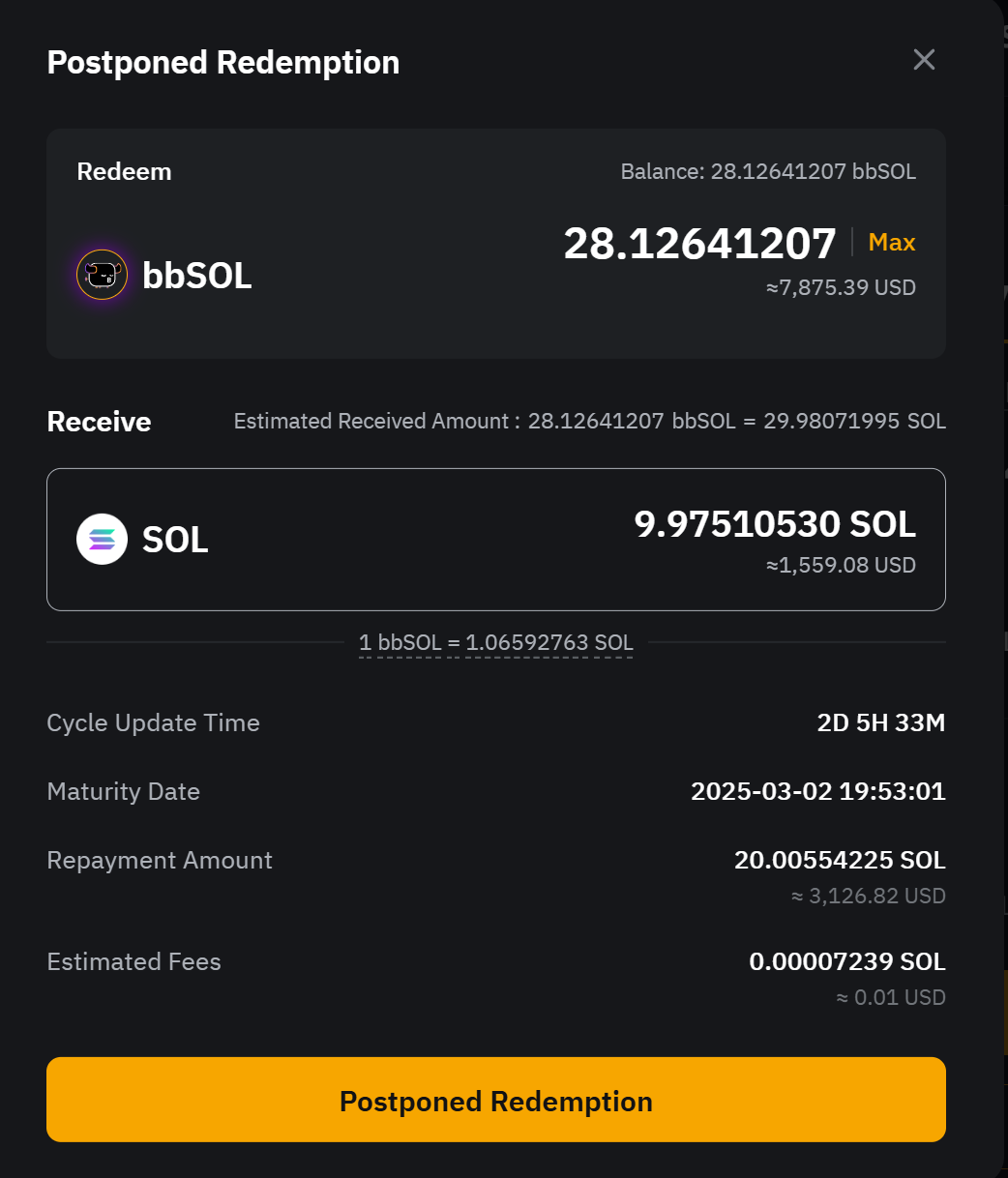 2. Відкладений викуп: Отримайте повну основну суму та всі прибутки після 1–4-денного періоду обробки, протягом якого відсотки продовжуватимуть нараховуватися. Ваші bbSOL буде конвертовано в SOL за актуальним курсом обміну, коли ви подасте запит на викуп.