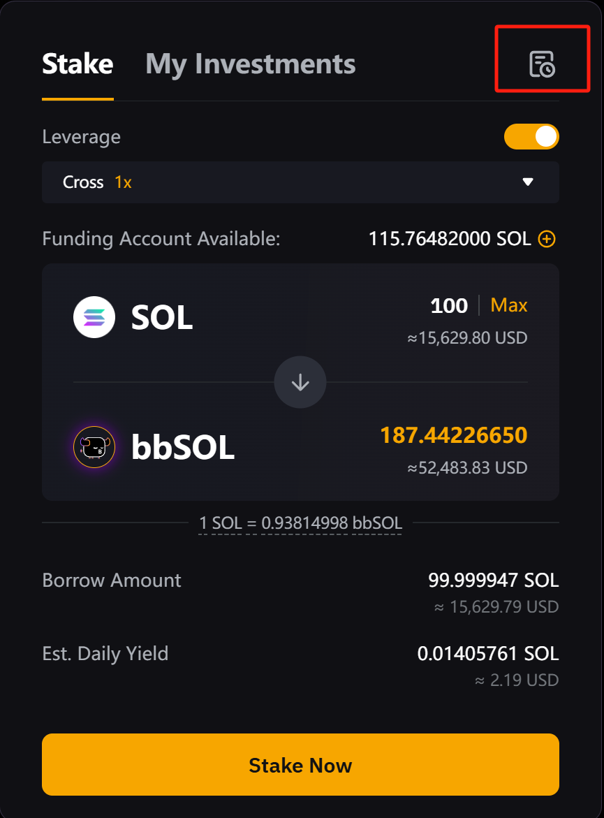 Крок 1. Щоб перевірити свої ордери, натисніть значок історії у верхньому правому куті панелі Стейкінг або Мої інвестиції на домашній сторінці SOL у маржинальному стейкінгу.