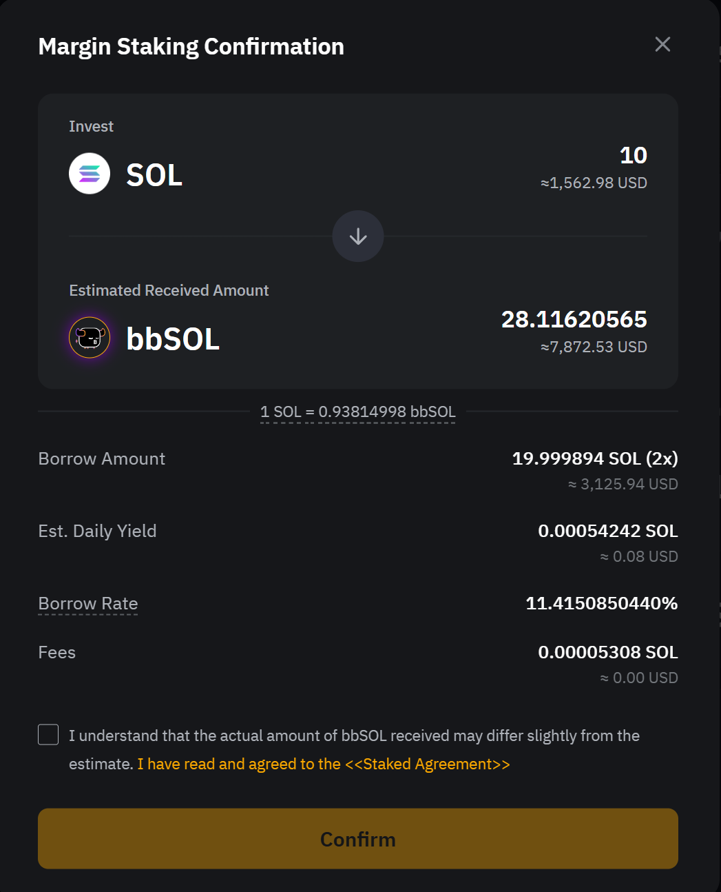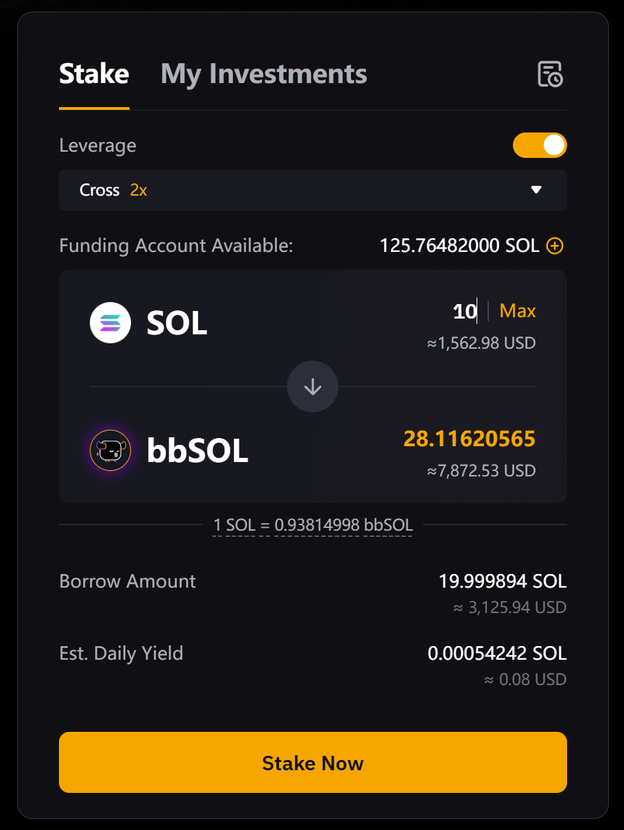 Очікувана сума bbSOL, яку ви отримаєте, розрахована на основі вашого кредитного плеча, суми SOL у стейкінгу та актуального курсу обміну між SOL і bbSOL.