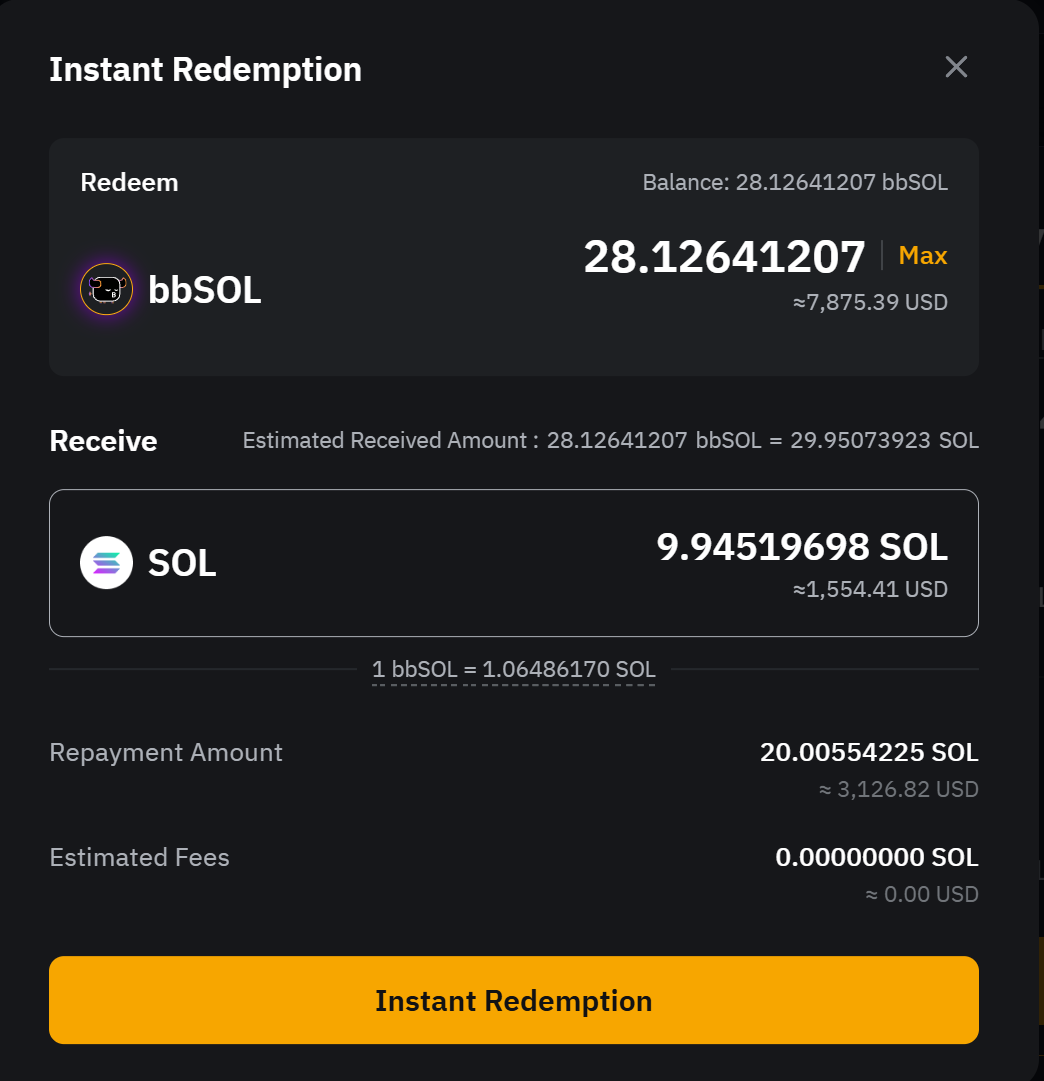 Крок 3. З’явиться спливне вікно підтвердження. Введіть суму bbSOL, яку ви бажаєте обміняти, або клацніть Макс., щоб викупити весь баланс. Система автоматично розрахує загальну суму SOL, яку ви отримаєте, на основі актуального курсу обміну, а також остаточну суму після вирахування погашення за позикою та будь-яких відповідних комісій. Уважно перегляньте деталі, а потім натисніть Миттєвий викуп або Відкладений викуп, щоб продовжити.