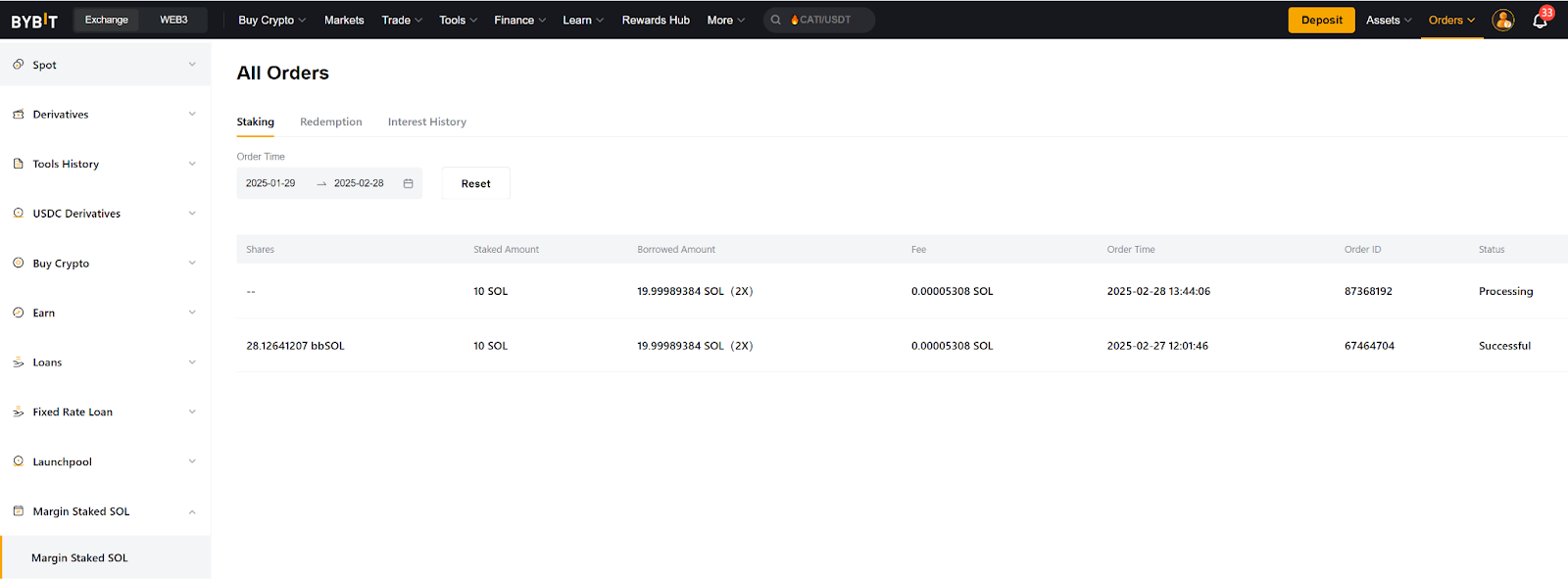 Крок 2. На сторінці Ордери маржинального стейкінгу SOL ви знайдете докладнішу інформацію в розділі Стейкінг, Викуп і Історія нарахування відсотків.