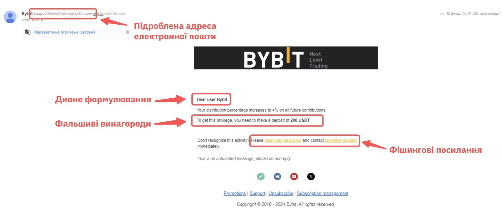 Як було сказано вище, навіть якщо результат перевірки є офіційним, контактну інформацію відправника можна легко підлаштувати за допомогою методів підробки. Нижче наведено типовий приклад того, як шахраї приховують та підробляють адреси електронної пошти відправників для вимагання активів від користувачів Bybit.