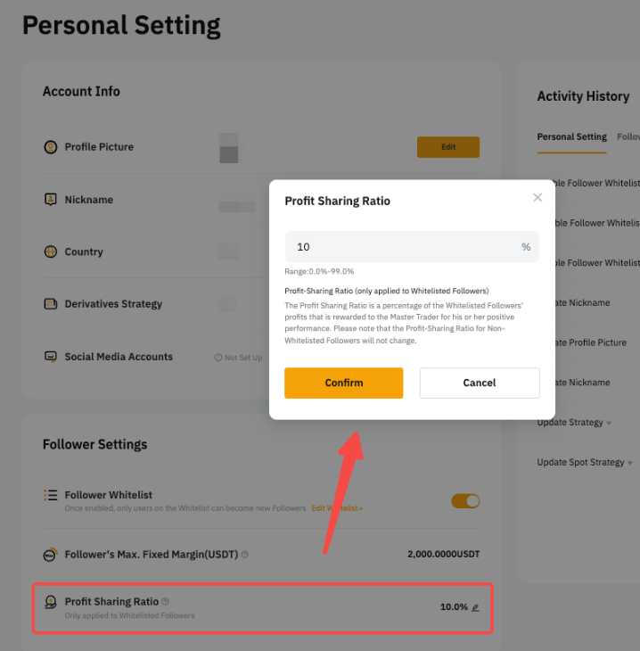 - Ви можете встановити коефіцієнт розподілу прибутку в діапазоні від 0% до 50%. Будь-які зміни застосовуватимуться до всіх підписників.