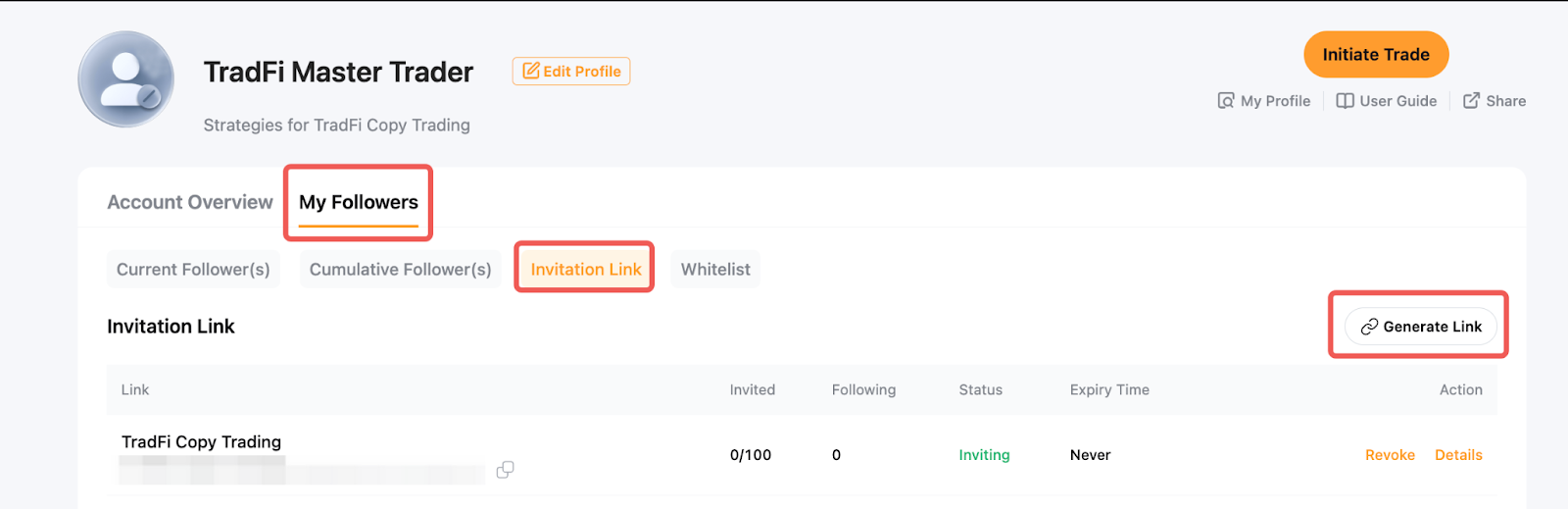 Як майстер-трейдер, ви можете згенерувати унікальне запрошувальне посилання, яке дасть змогу підписникам копіювати ваші угоди безпосередньо без додаткового підтвердження. Якщо білий список підписників увімкнено, підписники, які приєднаються за запрошувальним посиланням, будуть автоматично додані до білого списку.